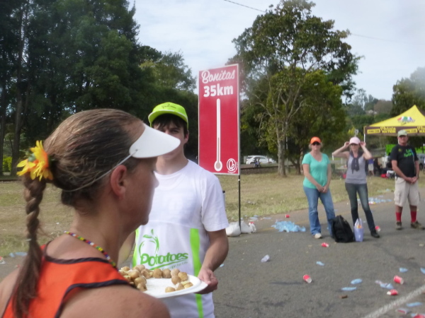 An der nächsten VP ist alles in Pink. Ein riesiges Früchte-, Kartoffel- und Keksbuffet ist aufgebaut. Wir plündern das Wasser. Man kann gar nicht so schnell kühlen, wie es heiß ist. Noch 42 Kilometer. Es geht ständig bergauf. Nun hat mich schon wieder ein 12 Stunden „Bus“ überholt. Die Leader motivieren die Läufer mit Sprüchen und Anweisungen. Aber Bergauflaufen kommt für mich nicht in Frage und so lasse ich die Gruppe ziehen.