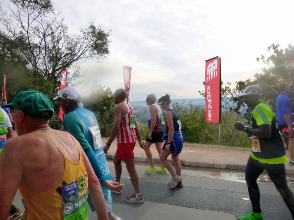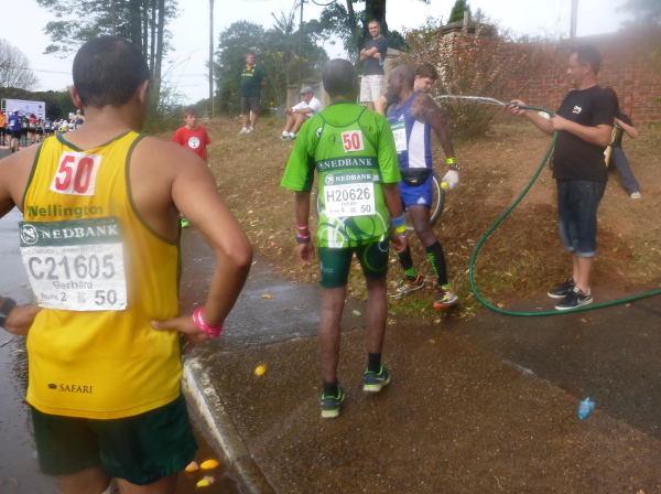 Ab und zu gibt es eine Dusche auf der Strecke. Ich nutze jede Möglichkeit zum Erfrischen. Mir tun die Füße weh und ich bin hammermüde. Sehnsüchtig warte ich auf Hills Crest, wo die Werner Otto Gruppe stehen soll. Dann sind es nur noch 35 km. Endlich sehe ich die langgezogene Fanmeile. Die gelben Fahnen sind schnell ausgemacht. Ein kurzes „Hallo“ und schon bin ich vorbei.