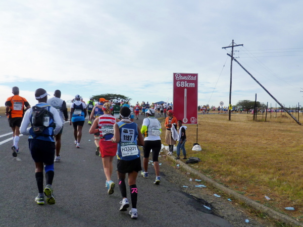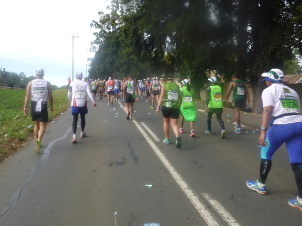 Um sieben Uhr ist es hell. Ich genieße die Landschaft und freue mich, hier sein zu dürfen. Ohne Pause stehen Zuschauer vereinzelt und in Gruppen an der Strecke. Jeder feuert uns an. Viele hoffen auf Kleidungstücke, die von den Läufern am Straßenrand zurückgelassen werden. Ich hatte mein Sweat- Shirt bereits am Start gelassen. Andere entledigen sich erst hier von überflüssigem Stoff.