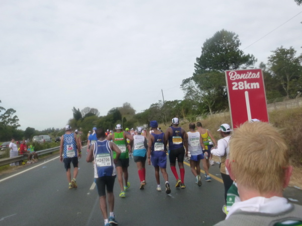 Die Strecke geht jetzt auf breiten Straßen tendenziell bergab. Es ist zwar anstrengend, aber ich kann jetzt locker laufen und überhole unzählige Geher. Wenn sich vor mir die nächste Läuferwand auftut, weiß ich, dass ich wieder einen Bus eingeholt habe.