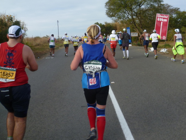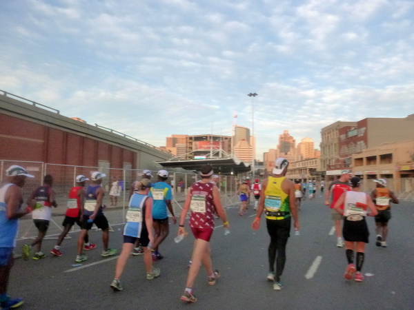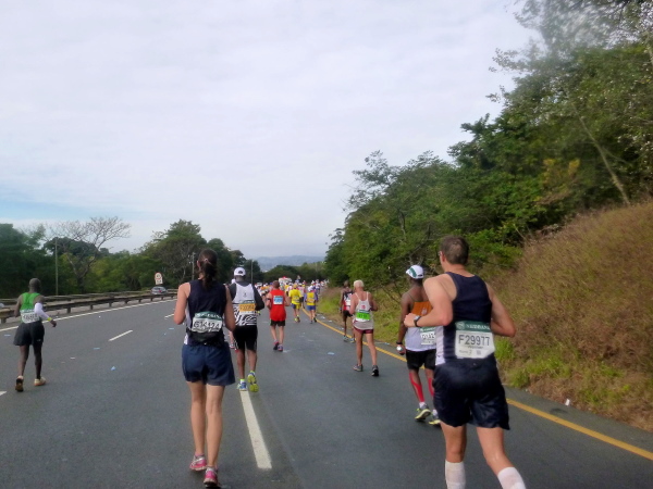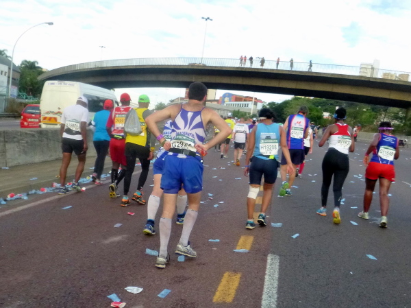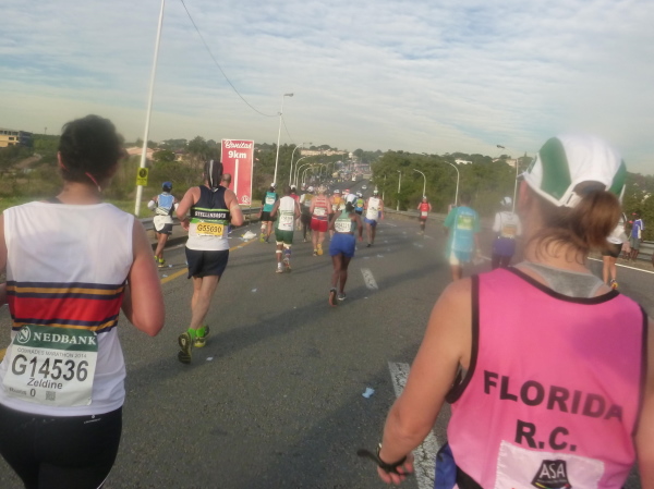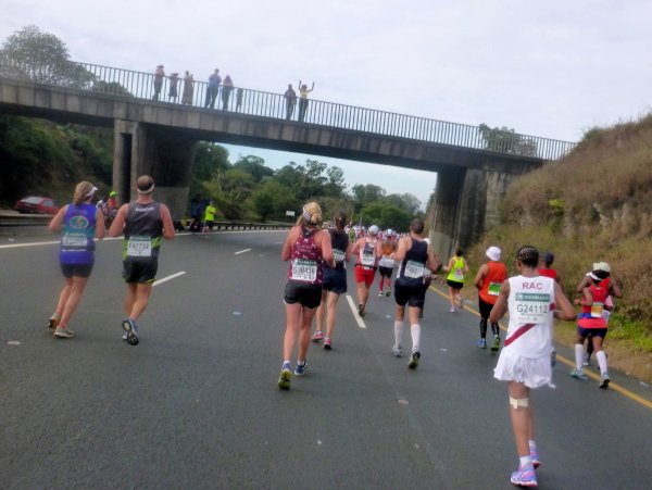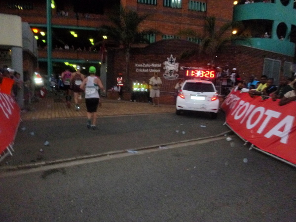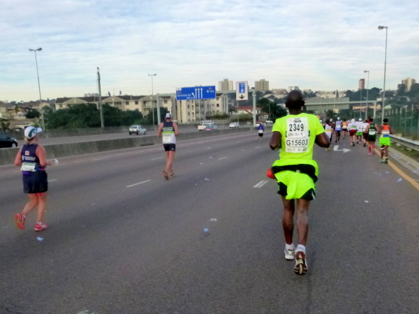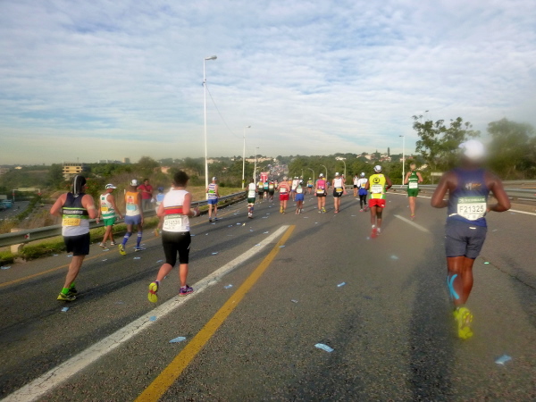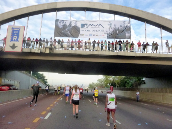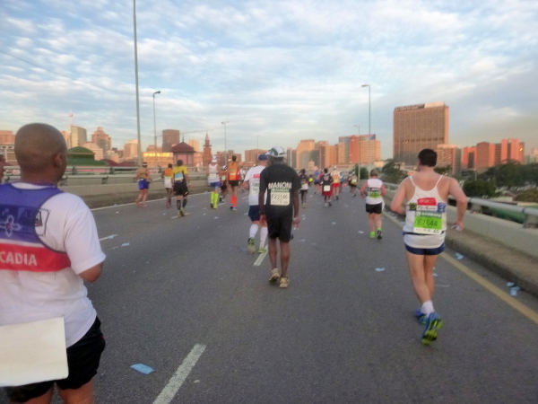 Den letzten Cut off bei km 82,2 durchlaufe ich mit 10 Stunden 47. Es geht noch mal eine längere Steigung hinauf. In der Ferne sind die ersten Hochhäuser Durbans zu erahnen. Langgezogen ist das nächste Gefälle und hinten geht es wieder bergauf. Wo bleibt denn die schöne Bogenbrücke, von wo aus man den tollen Blick auf die Durbaner Skyline genießen kann? Da ist eine Brücke, dann noch eine, dann sehe ich sie. Oben am Anstieg stehen viele Zuschauer. Unter lautem Jubel laufen wir unter der Brücke durch und haben die City von Durban zu unseren Füßen. Es dämmert schon und die Hochhäuser in der Ferne scheinen im letzten Sonnenlicht zu baden. Gebannt laufen wir dem Ziel entgegen.