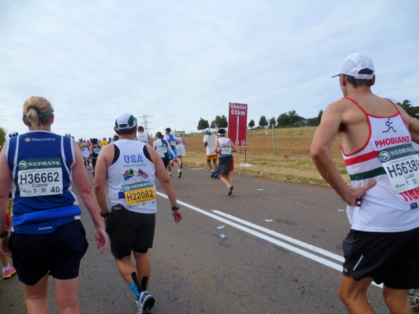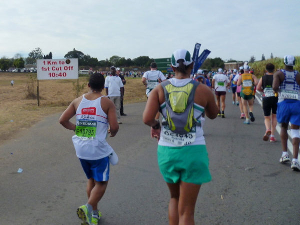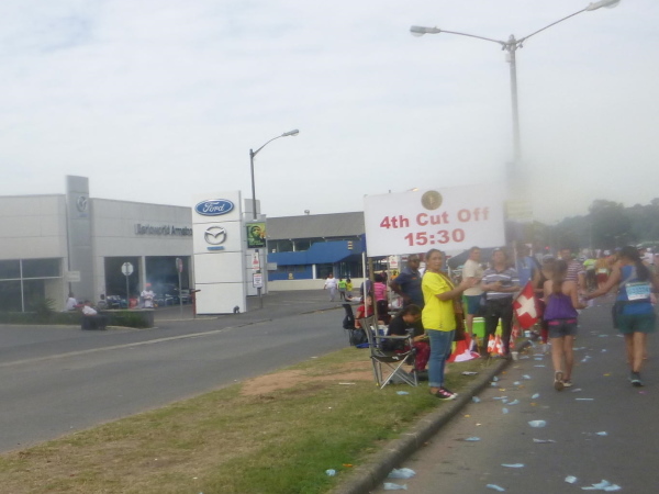 Bei km 62 (noch zu laufen) sehe ich plötzlich einen alten Bekannten: Klaus Neumann im Germany Shirt. Nach kurzer Unterhaltung macht er sich nach vorne davon. Ich behalte mein Tempo bei. Ungefähr bei km 60 passieren wir ein Schild, auf dem der erste Cut off in einem Kilometer Entfernung angekündigt wird. Hier muss man bis 10 Uhr 40 durch sein. Es ist gerade 9 Uhr 40. Am Cut off Punkt gibt es ein Zeitmessmatte, einige Zuschauer und viel Applaus.