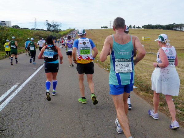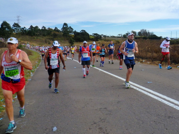 Es geht schon wieder bergauf. Von hinten kann ich bereits die Kommandos des Busführers hören; da flüchte ich schnell bergab. Und das Gefälle zieht sich. Als ich mir wünsche, dass es endlich wieder bergauf geht, wird es flacher. Ich muss nun eine Gehpause einlegen. Aber nur kurz, dann geht es wieder bergab. Noch 11 – 10 - 9 Kilometer. Die Gegend wir immer städtischer. Ist hier schon die Autobahn? Die dreispurige Straße ist voll mit Läufern.