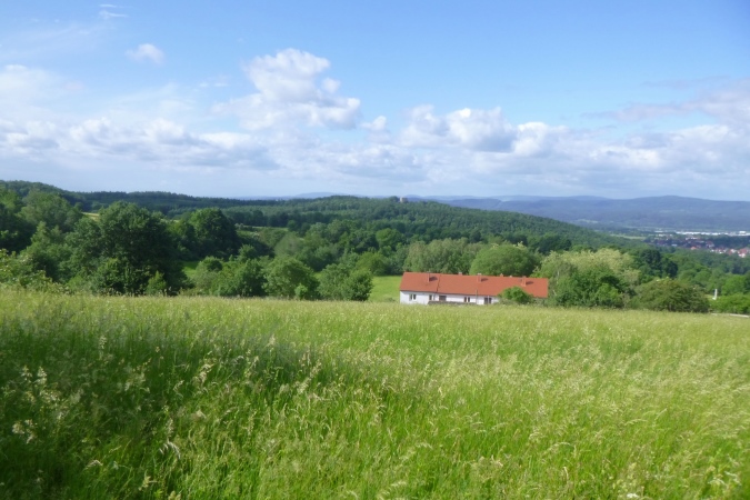 Noch ist es angenehm kühl, besonders im Schatten. Oben läuft es sich wieder richtig gut über Gras, dann Schotterwege, zu einer wunderbaren Aussicht über Bad Liebenstein und das westliche Rennsteigvorland. Die Ruine der Burg ragt hoch über den Wald auf. Sie ist unser nächstes Ziel.