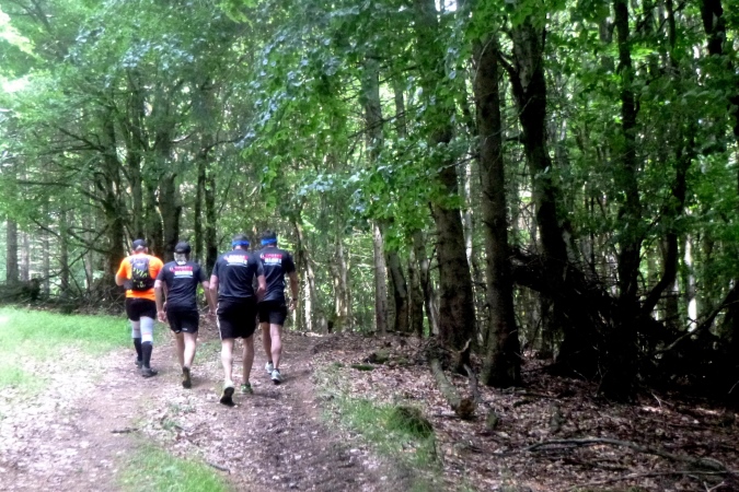 Diese ewigen Anstiege! Das Hirn schaltet auf Meditationsmodus um. Nur noch die Markierungen werden registriert und der nächste Anstieg dahinter. Was mache ich hier eigentlich? Ich wusste es doch. Aber es ist insgesamt einfach zu schön. Allen HM zum Trotz erreiche ich VP2, dann geht es genauso weiter: Ins und ums Gehege, Teiche, Wiesen, Bäche, Schlamm, immer kreuz und quer. Gestürzte Bäume zwingen zu kleinen Umwegen, die heute ganz früh noch einmal markiert wurden. Der Regen heute Nacht machte es notwendig … Auch die Pfeile in blau wurden alle nochmals nachgezogen. Die Orga kümmert sich vorbildlich!