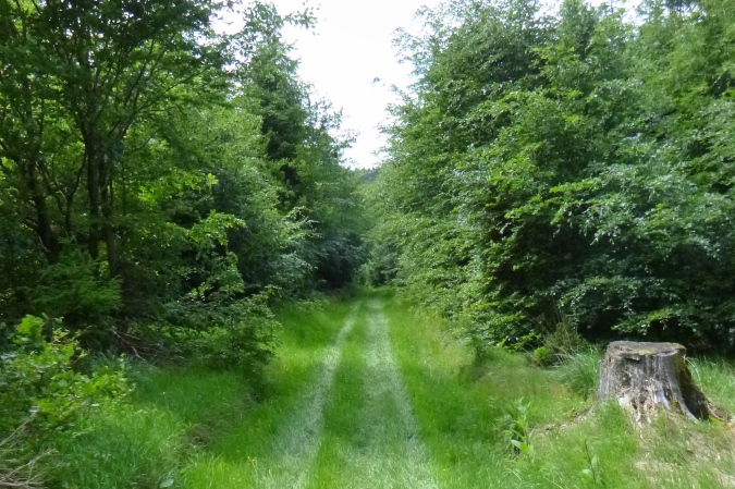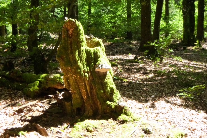 Alte Grenzsteine, verpilzte Baumleichen und auf einmal scharf links abwärts, ganz runter ins Tal der Laucha. Auf dem Höhenprofil ist es eine tiefe Kerbe. Mir wird klar, jeden Höhenmeter runter muss ich gleich wieder hoch. Aber jetzt erstmal genießen und rollen lassen. Sowas kommt so schnell nicht wieder.