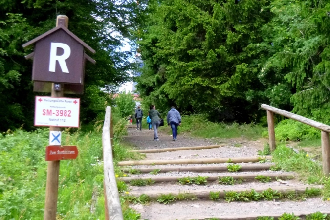 Waldwege mit Treppen bringen uns erst zum Felsentheater, dann um den Berg rum zur Burg hoch, schroffe Felsen überall. Im Handumdrehen liegt der erste VP vor uns. Das ging ja flott, denke ich noch, das lässt sich gut an. Naja, bis hierher jedenfalls, denn jetzt wird’s brutal. Steile, vor allem endlose Anstiege folgen, die meisten zum Glück im Schatten. Oben zweigt es ab zu den schönsten Südthüringer Aussichten. Die lassen wir mal aus, unsere Aussichten sind ganz andere, aber auch sehr schön. Immer wieder gibt es diese massenweise ans Holz genagelten Wegweiser. Ist halt ein beliebtes Wandergebiet hier.