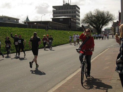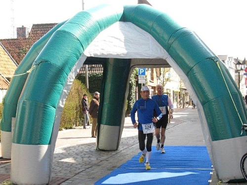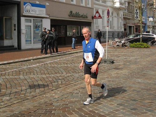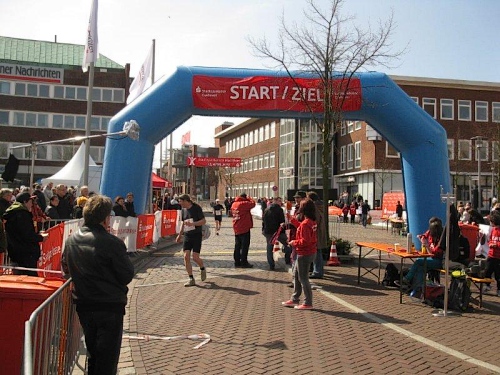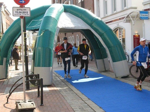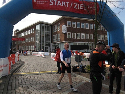 Wieder geht es den Deich hinauf und auf der Wasserseite haben wir den Wind wieder genau von vorne. Ich ziehe den Reißverschluss meiner Laufweste schnell wieder hoch und bin froh dass ich sie dabei habe. Am Kurpark ziehen die Halbmarathonläufer bereits zum langgezogenen Endspurt an, denn sie sind ja gleich im Ziel. Im Lotsenviertel treffe ich meine liebe Inge, welche sich auch ein wenig die Strecke ansehen will. Hier fällt mir eine kleine Zuschauergruppe auf, welche die ganzen vier Runden unermüdlich lautstark alle Läufer anfeuert. Wenn sie von den Läufern eine dankbare Reaktion erfahren, verdoppeln sie gleich den Lärmpegel. Hier laufen wir auch auf einem blauen Teppich stimmungsvoll mit Musikbegleitung unter einem großen Bogen hindurch.