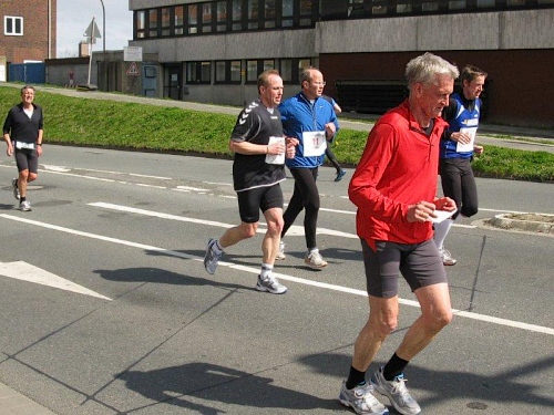 Hier ist jetzt auch wieder eine Verpflegungsstelle eingerichtet. Das Angebot ist mit Wasser, Iso und Cola gut. Auch Apfel- und Bananenstücke sind im Angebot. Am Kurpark vorbei geht es auf den Unteren Döser Seedeich. Jetzt laufen wir windgeschützt in der Sonne und schon bald nehme ich meine Mütze ab, da es mir zu warm wird. Dann kommen uns schon die schnellen Läufer in ihrer zweiten Runde entgegen. Ein Polizist auf einem Motorrad macht der Spitze mit Blaulicht den Weg frei. Durch das Lotsenviertel geht es wieder mit viel Beifall Richtung Kämmererplatz zum Wendepunkt in der Rohdestraße.