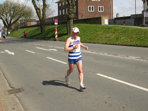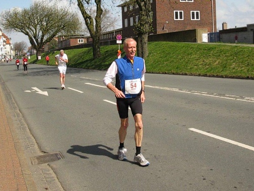 Inzwischen ist es ja bereits Mittag. Im Lotsenviertel treffe ich wieder meine Inge und sie wünscht mir viel Glück für die zweite Hälfte. Als ich nun den Deich hoch laufe, merke ich die Steigung deutlich. Am Wasser hat der Wind noch weiter aufgefrischt, oder ich empfinde es zumindest so. Da die Läufer sich weit auseinander gezogen haben, gibt es auch keinen Windschutz mehr. Jetzt muss jeder für sich kämpfen und ich freue mich, wenn ich jemanden überholen kann.