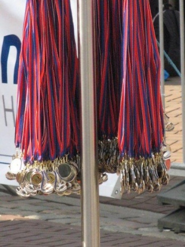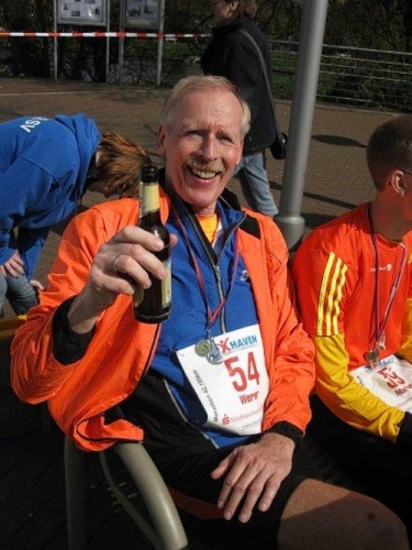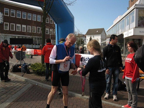 Der Deichweg besteht aus Verbundpflaster und Betonstreifen. Hier oben ist es durch die vielen Fußgänger jetzt eng geworden, denn der Weg ist doch schmal und nicht abgesperrt. Wie gut, dass wir Läufer meistens schlank sind und wenig Platz brauchen. Noch einmal laufe ich nun den Deich hinunter in die Stadtmitte. Ich verabschiede mich von der Fangruppe, die in der der Schillerstraße immer noch Stimmung macht. Etliche Zuschauer harren noch aus und am Kämmererplatz werden weiter die Finisher gefeiert. Nochmals geht es durch die kleine Schleife, dann habe ich nach 4:15:20 das Ziel erreicht. Das ist für mich Platz 2 in meiner Altersklasse.
