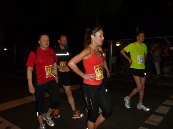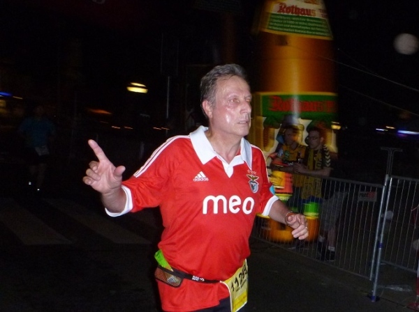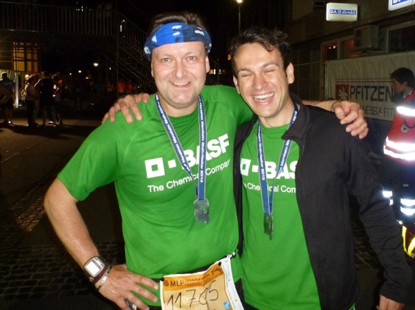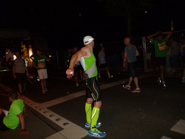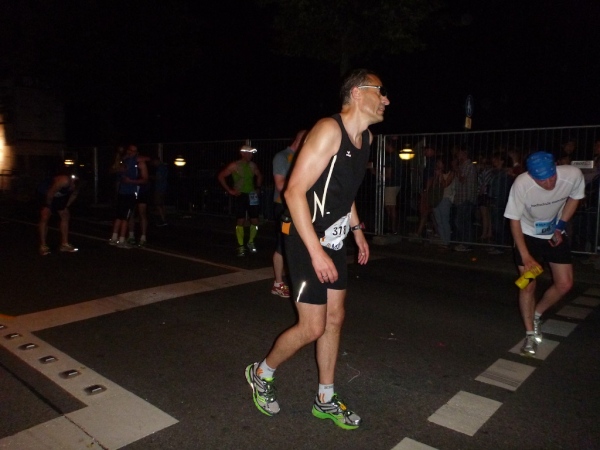 Kilometer 30, mittlerweile sind wir am südlichsten Punkt des Kurses in Rheingönheim angekommen. Mittlerweile dämmert es (uns) gescheit. Beim Blick auf eine Kirchenuhr errechne ich für mich noch eine Zeit von gut 3.15 Stunden, bin aber schon platt wie eine Flunder. Die hohen Temperaturen haben mir sprichwörtlich den Saft aus dem Körper gezogen. Einigen Mitstreitern geht es noch schlechter, mit Laufen ist nichts mehr. Lediglich die Staffeln sind gut drauf, denn sie bringen ja immer wieder neue Kräfte ins Rennen.