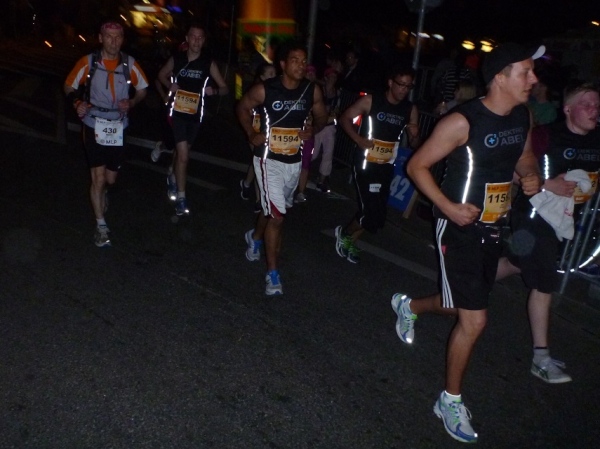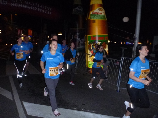 Kilometer 5: Direkt an der Unterführung der Autobahn 6 die erste Wasserstelle. Zwei große Schluck für den Bauch und der Rest für die Birne, so geht es ohne Stopp im Galopp weiter. Ein Wort zur Verpflegung: Klasse, denn ab sofort erhält der Durstige alle 2,5 Kilometer Trinkwasser, Mineralwasser und Elektrolytgetränke. Im Abstand von jeweils fünf Kilometern werden zudem Müsliriegel, Bananen und Energieriegel gereicht. Ab Kilometer 30 kommen noch Cola und Energie-Gel dazu. Verhungern und verdursten braucht da keiner.