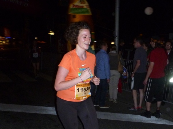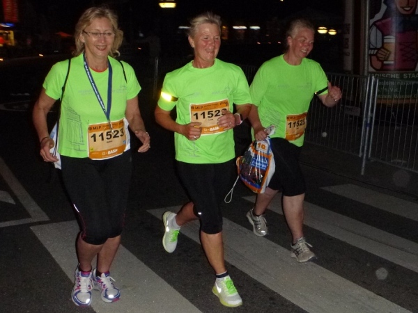 Kurz nach der folgenden Wechselstelle der Staffelläufer führt uns eine Umgehungsstraße an Seckenheim vorbei. Links ein Lärmschutzwall, rechts grüne Felder. Langeweile kommt nicht auf, denn die Anwohner hocken hoch oben mit Tröten oder stehen am Straßenrand beim „Marathon-Schauen“.