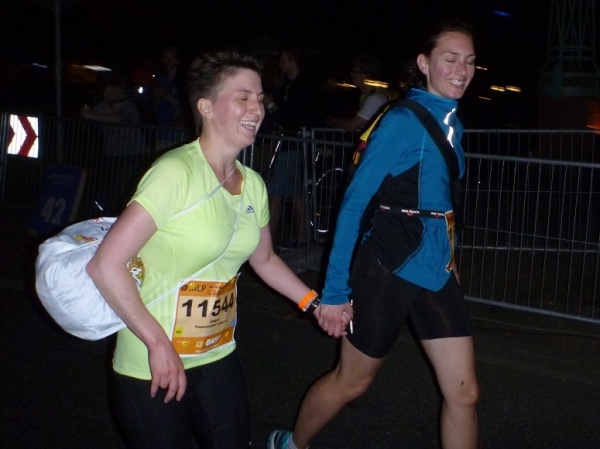 Kurz nach Kilometer 37 kommt die härteste Prüfung: Wie müssen nochmals über den Rhein. Beim Anstieg auf die Hochstraße leide ich elend. Da hilft nicht mal der Blick auf die andere Seite, wo die Letzten des Marathons gerade die Schleife durch Ludwigshafen beginnen. Drei, vier Helfer, sonst macht auf diesen einsamen Kilometern im Umfeld der Brücke kaum jemand ein wenig Stimmung. Denen sei aber recht herzlich gedankt.