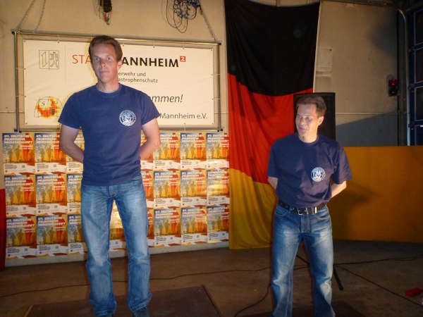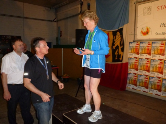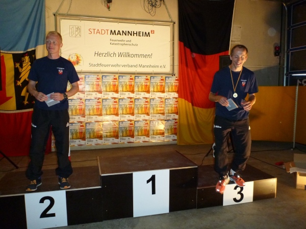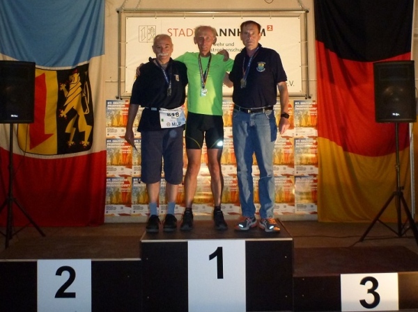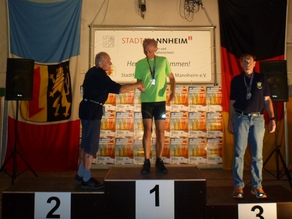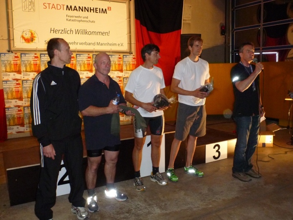 Gegen Mitternacht fahre ich zur Feuerwache Mitte, unsere Siegerehrung steht an. Die zieht sich zwar in die Länge, beginnt aber dann gegen 01.00 Uhr. Hochzufrieden bin ich, als man meine Klasse von Platz drei her ehrt und ich nicht Dritter und auch nicht Zweiter bin, sondern als ich auf das Siegerpodest ganz nach oben darf. Super. Eine Top-Platzierung war mein Ziel heute und dass der Sieg in der Altersklasse herausgesprungen ist, war nicht unbedingt erwartet. Aber wenn es läuft, dann läuft es.