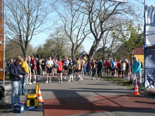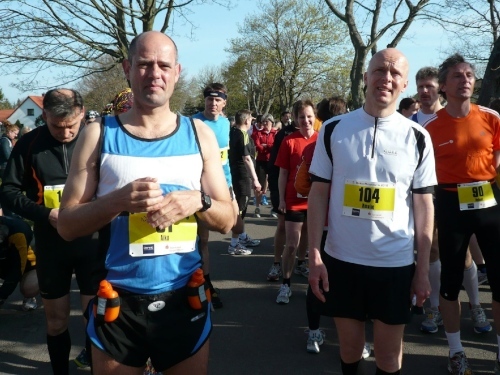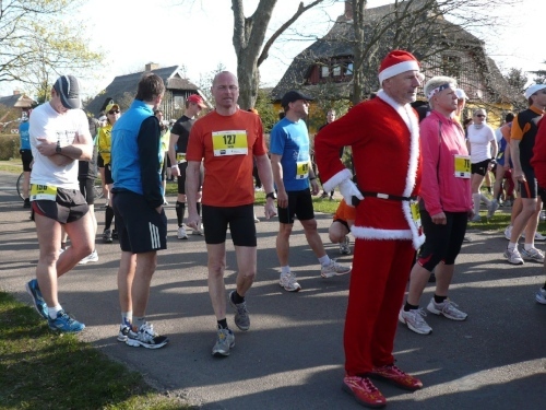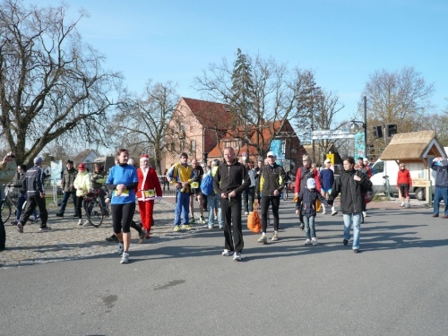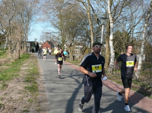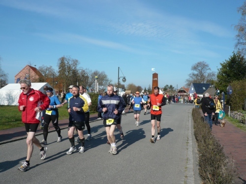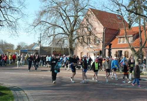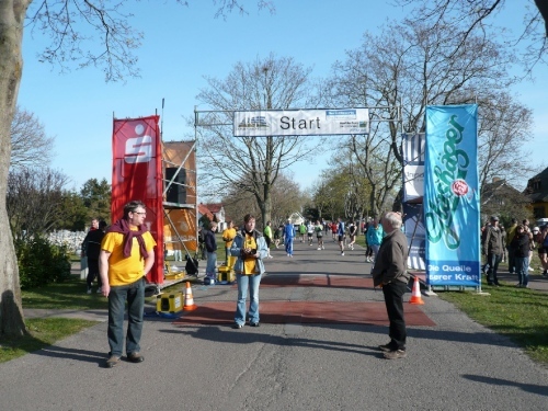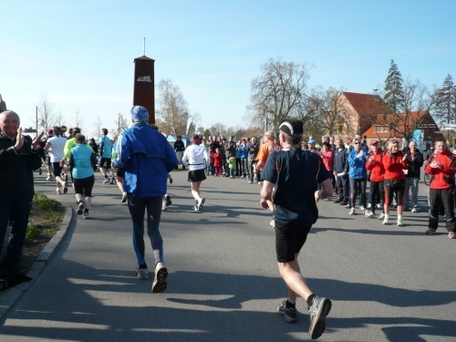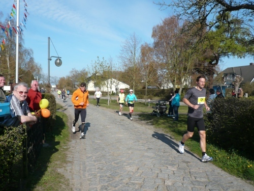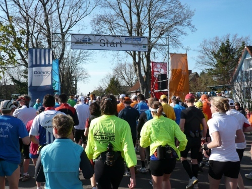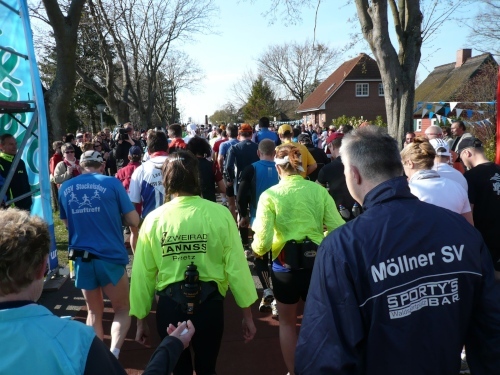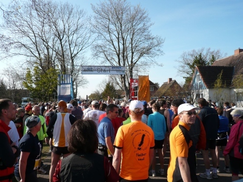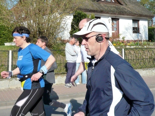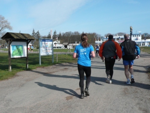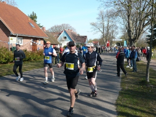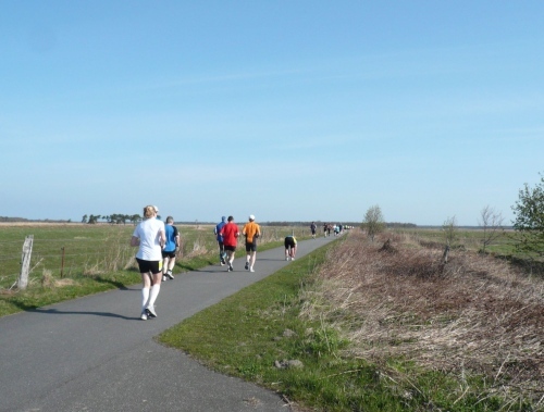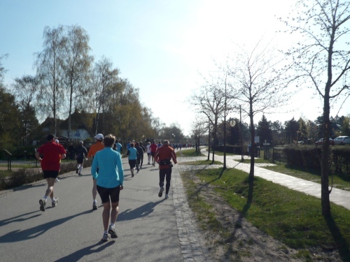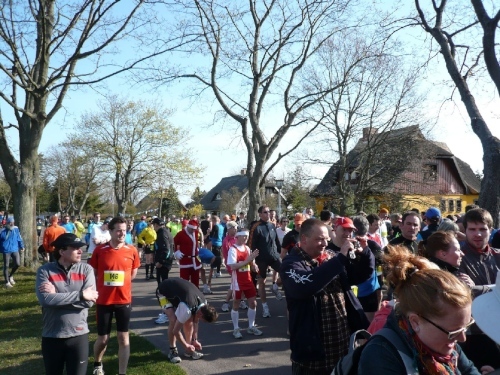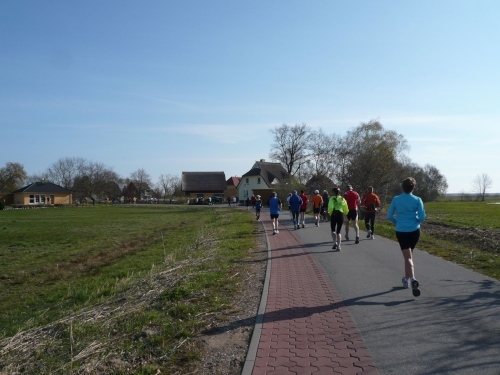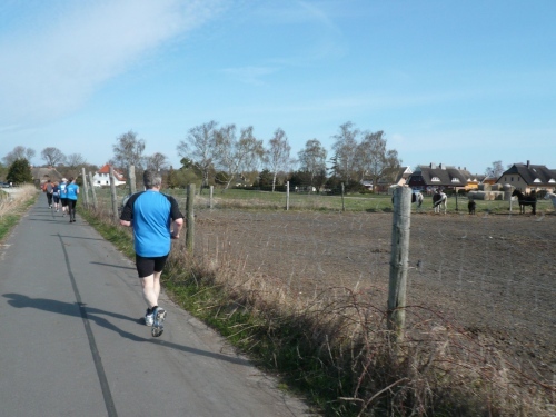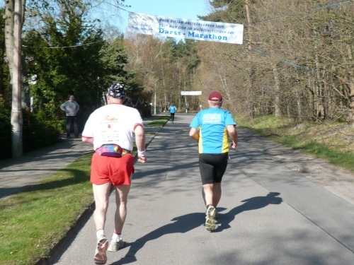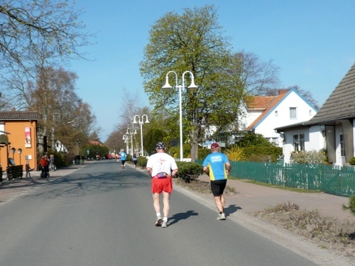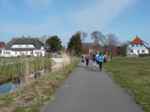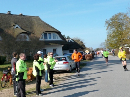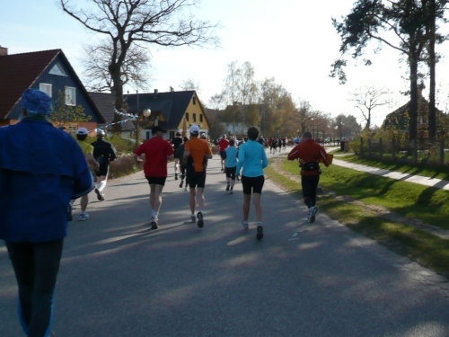Um 9 Uhr macht sich ein kleines Feld von knapp 400 Marathonis auf die Strecke. Es geht vom Start zur Darßer Arche und weiter unter dem Starttor für die Halbmarathonis durch über den Müggenberg (Straßenname, kein Berg). In den Vorgärten stehen die Anwohner und ein Teil der um 10 Uhr startenden Halbmarathonis und jubeln den Läufern zu. Wir verlassen den Ort über Kopfsteinpflaster und es geht über einen Feldweg am Wasser entlang.
