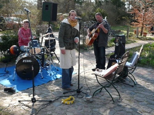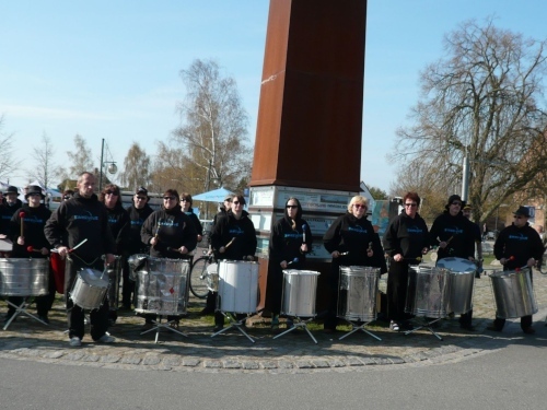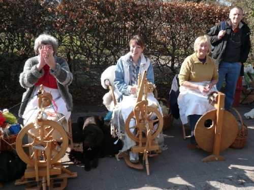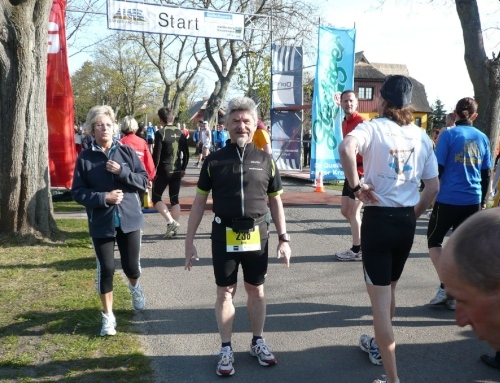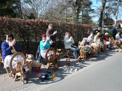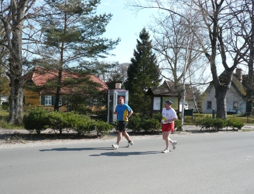 Hinter Km 8 vor dem Darß Museum sitzen 12 Frauen mit ihren Spinnrädern. Sie freuen sich riesig, als ich sie fotografiere. Kurz dahinter im Biergarten gibt es Live-Musik für die Frühaufsteher. Auf einem großen Banner an der Straße steht: "Vogel fliegt, Fisch schwimmt, Mensch läuft." Den Spruch kennen wir doch alle von der tschechischen Lokomotive Emil Zatopek, der zweimal bei den olympischen Spielen den Marathonlauf gewann.