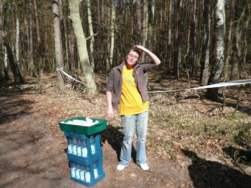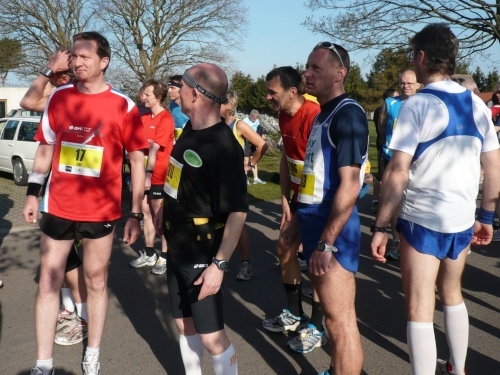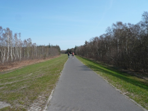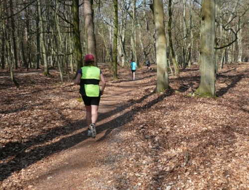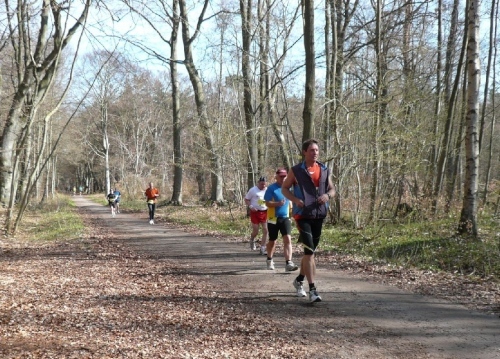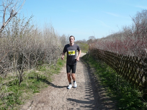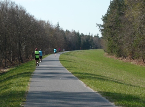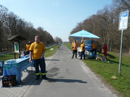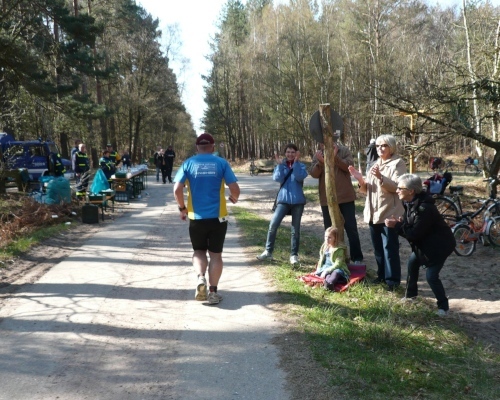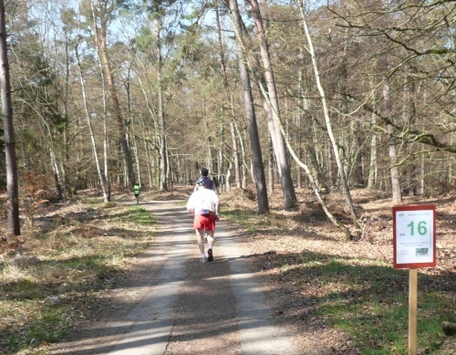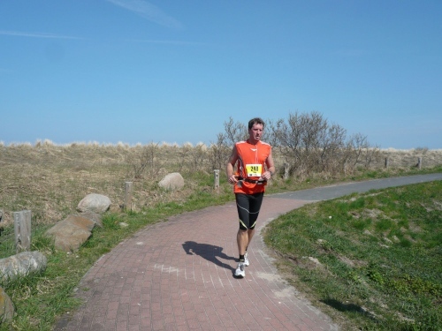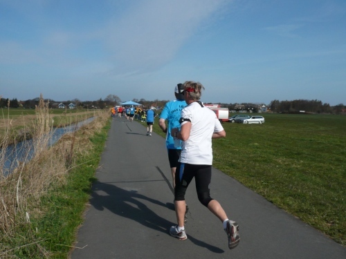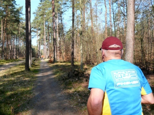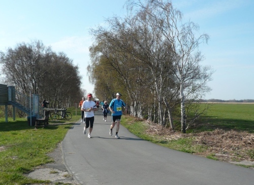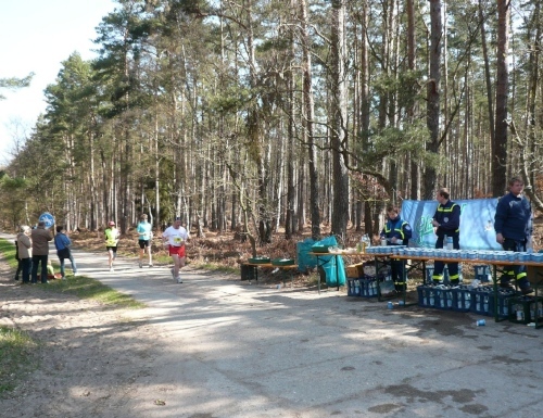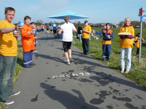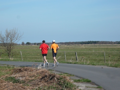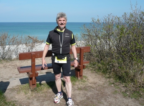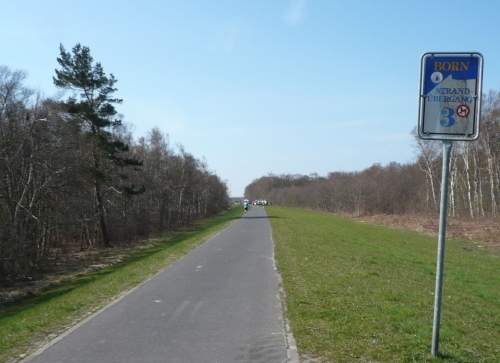 Bei km 15 gibt es wieder Essen und Trinken. Es geht weiter durch den herrlichen Wald und bei den Drei Eichen bei km 19 kommen wir auf den geteerten Deichradweg. Jetzt liegt der Deich in seiner endlosen Länge vor uns. Wie gern hätte ich jetzt den Blick nach rechts frei gehabt zum Strand, der nur einige Meter hinter dem Baumstreifen liwgt. Ab den ersten Strandübergängen begleitet uns jetzt die L21. Hier und da kann man zwar den Sand schon sehen, nicht aber das Meer. Wir sind im Bereich von Born, obwohl das auf der Boddenseite und nicht auf der Ostseeseite liegt. Born werden wir erst bei Km 33 – 38 durchqueren. Nach 2 Kilometern auf dem Teich kommt die Halbmarathonmatte, die freundlich piepst.