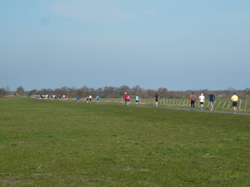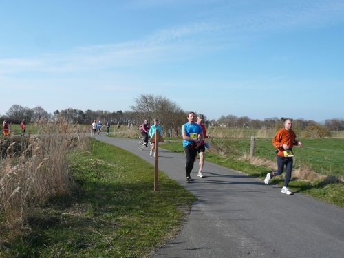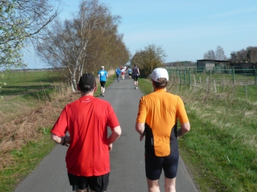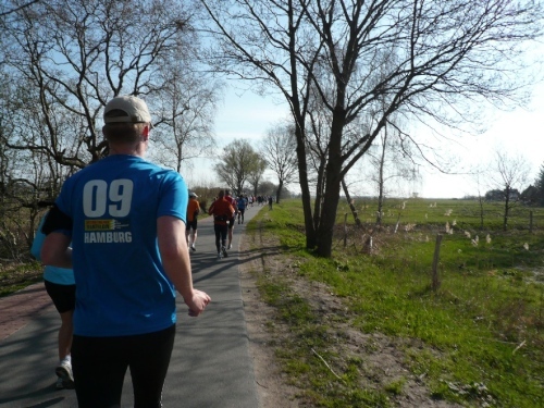 Bei km 4 verlassen wir den Bodstedter Bodden und laufen durch die Wiecker Wiesen, einer flachen Wiesenlandschaft, in einem Winkel Richtung Hafen Prerow. Rechts von uns ein Hochstand von dem aus einer Vögel beobachtet. Die Sonne wärmt uns jetzt angenehm und die ersten binden sich ihre Jacken um. Kurz vorm Ort kommt die erste Verpflegungsstation mit Essen und Trinken. Am Hafen von Prerow überqueren wir die L21 die Bäderstrasse und kommen in den Ort.