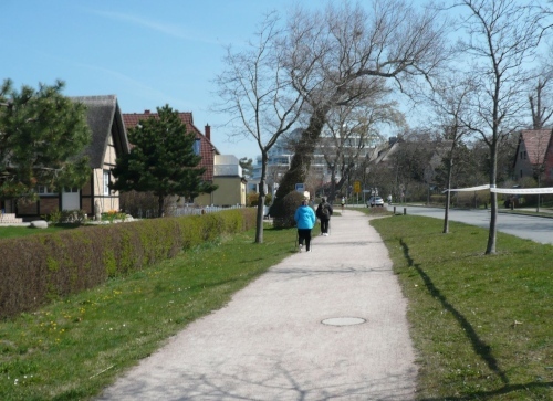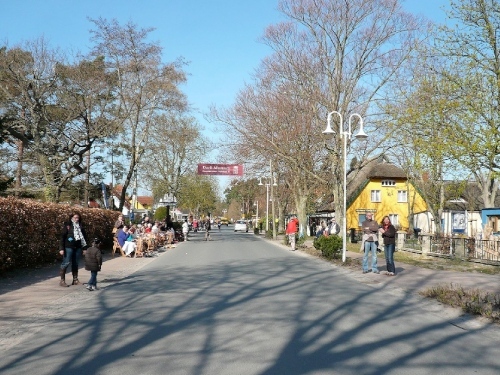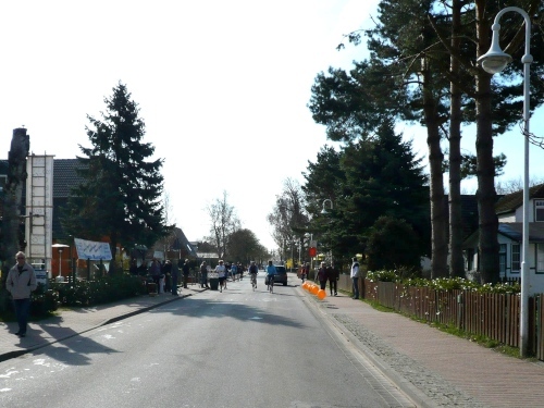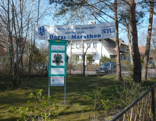 Die Laufstrecke führt über die Hafenstrasse zur Strandstrasse, Anwohner und Gäste und jubeln uns zu. Entlang der Srasse hängen viele große Transparente, die die Läufer zum 5. Darßmarathon grüßen. Wir kreuzen die Ladenstrasse die direkt an den Strand führt. Aber auf den müssen wir noch einige Kilometer warten.