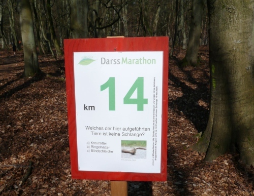 Am Peters Kreuz gibt es wieder Essen und Trinken und einige Spaziergänger die uns zujubeln. Wir ändern die Richtung und es geht weiter der Küste entgegen. Km 14, wie immer steht auf dem Hinweisschild eine Frage und Anwort in Zusammenhang mit dem Naturschutzgebiet und deren Bewohner.