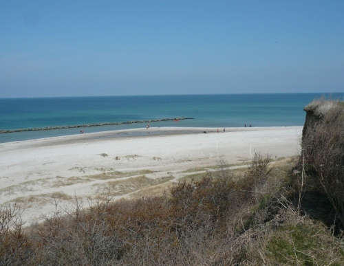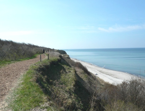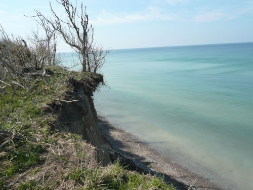 Bei km 23 geht es eine kurze Rampe hoch Richtung Strand. Jetzt ist sie da, die Ostssee - herrlich. Malerische Ausblicke auf das Wasser, den Strand und die Steilküste liegen vor uns. Ein Ort zum Erholen und Träumen, aber wir müssen leider weiter. Man versteht, warum sich hier gerne Künstler niedergelassen. Besonders interessant und oft gemalt sind die Windflüchter. Das sind Bäume und Sträucher, deren Wuchsform vom oft einseitig wehenden Wind geformt sind.