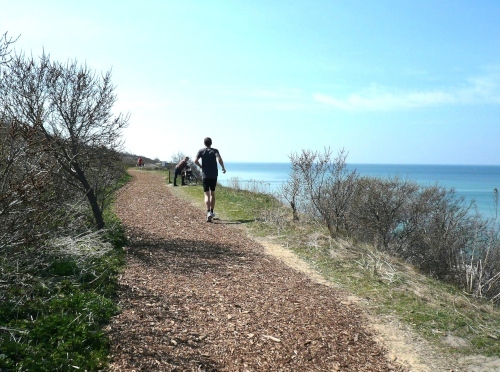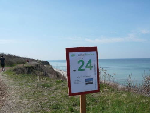 Hinter km 24 muss ich noch mal halt machen und knipsen. Wir sind auf der Steilküste, die einen herrlichen Ausblick auf die Ostsee ermöglicht. Nach einem Kilometer müssen wir leider den herrlichen Ausblick verlassen und der Weg führt uns noch zwei Kilometer an der Küste entlang, mit nur gelegentlichem Blick aufs Meer. Hier durchlaufen wir auch die Grenze vom Darß zum Fischland. Alle drei, Fischland, Darß und Zingst waren einst eigenständige Inseln, aber durch allmähliche Verlandung und nach der großen Sturmflut 1872 wuchsen die drei Inseln zusammen.
