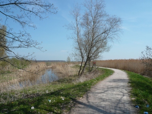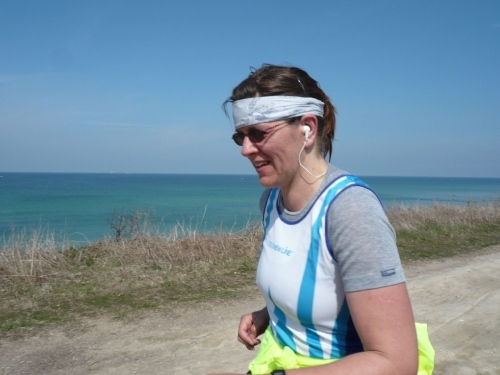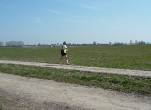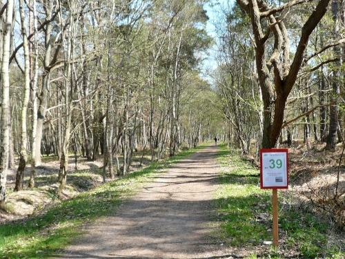 Ich drücke einem Spaziergänger mein Fotoapparat in die Hand und bitte ihn mich zu knipsen, bevor es weiter geht über sandigen Untergrund. Dann geht es weiter auf einer Finnenboden-Strecke (Rindenmulch), die fast 2 Kilometer lang ist. Dann folgt eine wahre Herausforderung für Sehnen und Gelenke, denn es geht über einen schiefen und ausgetrockneten Feldweg.