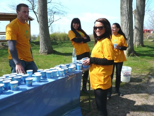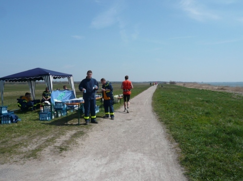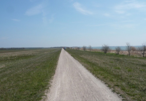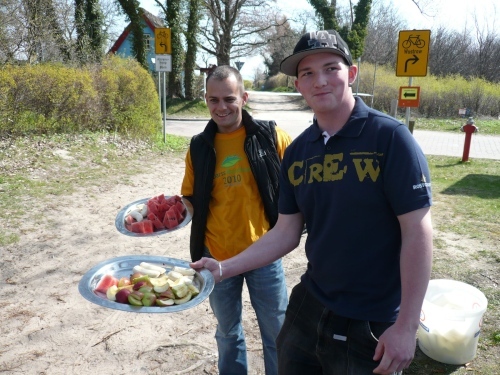 Kurz vor Wustrow verlassen wir die Küste und es geht auf einem Feldweg bergab in Richtung Niehagen. Hier spenden uns vereinzelte Bäume spärlichen Schatten. Wir durchqueren das Fischland hinunter zum Saaler Bodden. Am Ortseingang erwarten uns wieder freundliche Helfer mit Essen und Trinken.