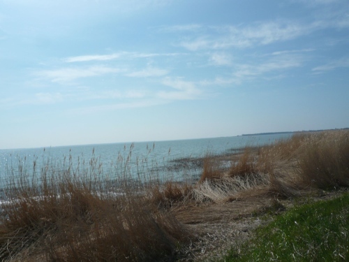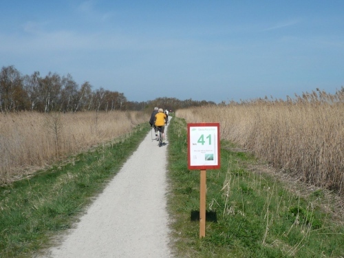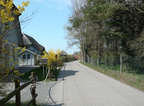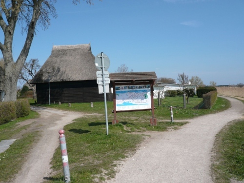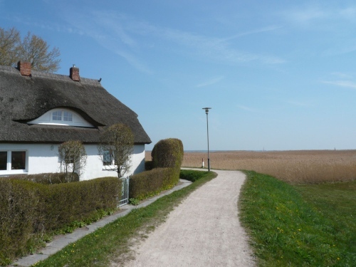 Wir laufen an einigen Häusern vorbei und kommen an den Schilfgürtel auf den Boddenwanderweg nach Althagen. Dieser Schilfgürtel bietet einerseits Schutz für viele Vögel in der Brutzeit, er ist aber andererseits Rohstofflieferant für die Reeteindeckung der Häuser. Das Schilf hat eine lange Lebensdauer und schützt im Winter gegen Kälte und im Sommer vor der Hitze. Dieser natürliche Rohstoff wächst hier kilometerlang am Bodden in reichlicher Menge.