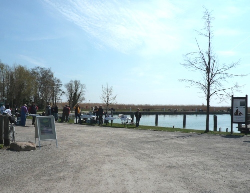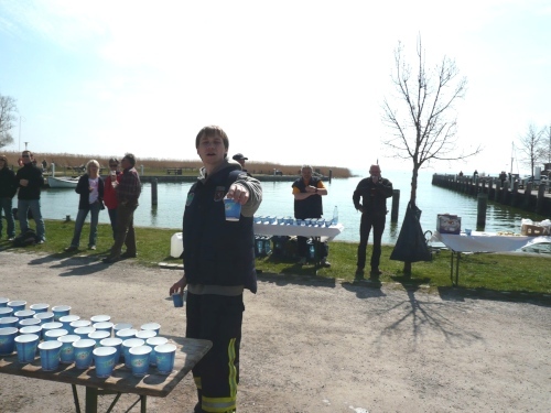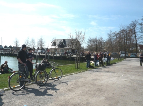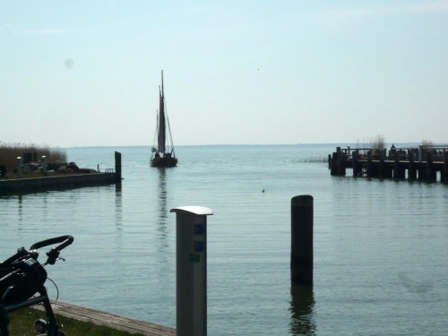 In Althagen werden wir am Hafen von einigen Cafegästen lautstark begrüßt. Die Feuerwehr am Hafen versorgt uns wieder mit Essen und Trinken. In den Hafen läuft gerade eines dieser Zeesenboote ein. So ein Zeeskahn ist ein Segelboot, das speziell für flache Gewässer geeignet ist. Schon von weitem sind die rostfarbenen Segel zu sehen.