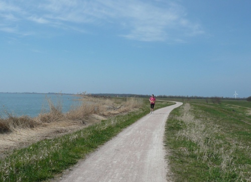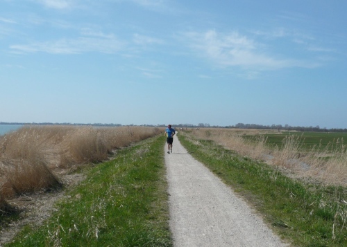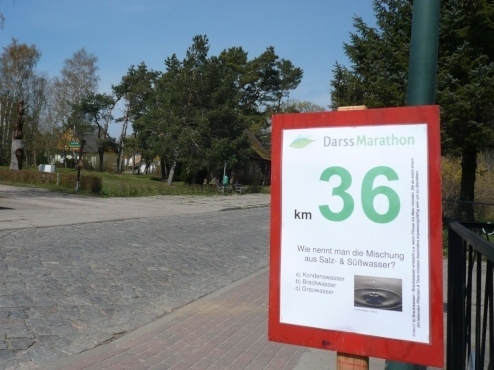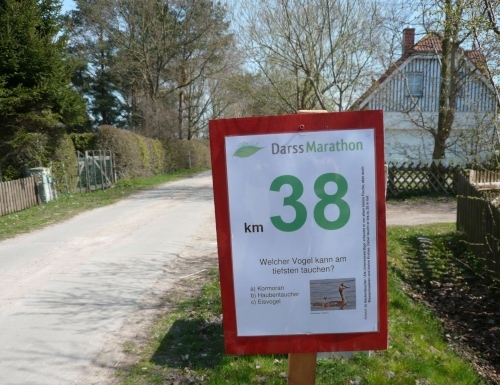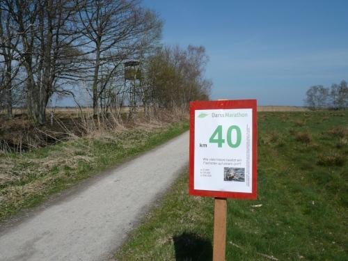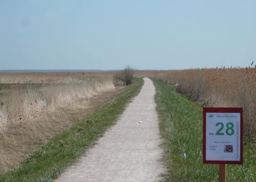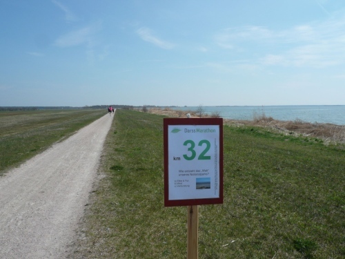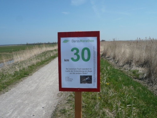 Hinter km 27 geht es weiter auf dem Boddenwanderweg Richtung Born. Die Laufstrecke verläuft auf dem Deich und ist ein fester und ebener Naturweg. Von rechts schimmert die Sonne über den Bodden auf uns. Links des Weges befinden sich grüne Wiesen. Wir fressen die Kilometerschilder. Schild KM 28 - Was sind Korallen? Schild KM 30 - Bei welchem Fisch wandert im Laufe der Entwicklung ein Auge auf die andere Seite? Schild KM 32 - Wie entsteht das „Watt“ unseres Nationalparks? Dazwischen eine Wasserstelle und in der prallen Sonne geht es weiter.