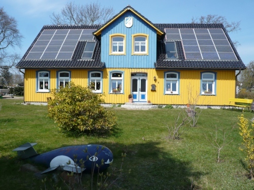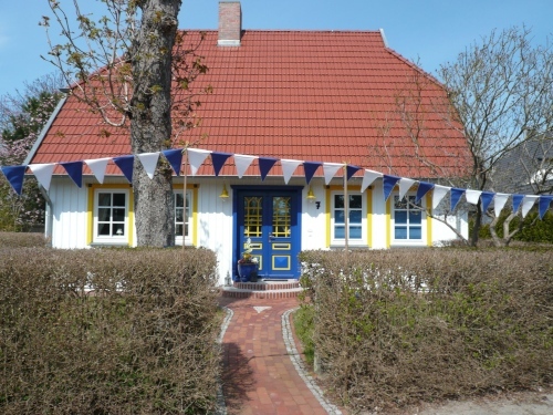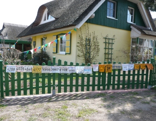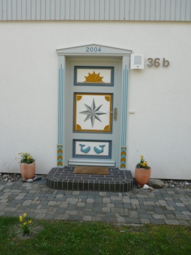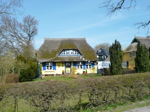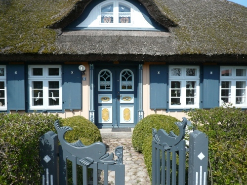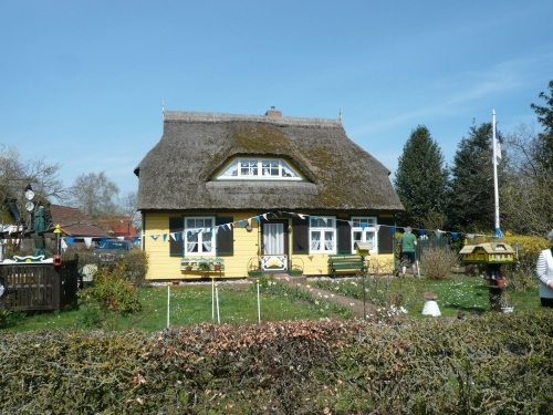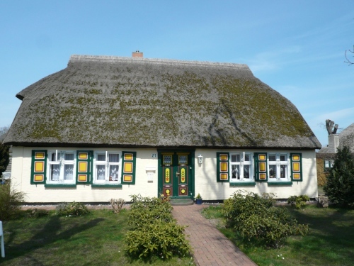 Born hat die typischen Darßhäuser, deren Dacheindeckung aus Schilfrohr (Reet) besteht und die schönen bunten Haustüren mit ihren kunstvoll geschnitzten Ornamenten. Endlich sehe ich sie auch im Original und da sind sie viel schöner im Rahmen dieser wundervollen Häuser als nur auf den Postkarten. Man begann Ende des 18. Jhd. diese Türen mit Schnitzereien, Symbolen und Farben zu schmücken.
