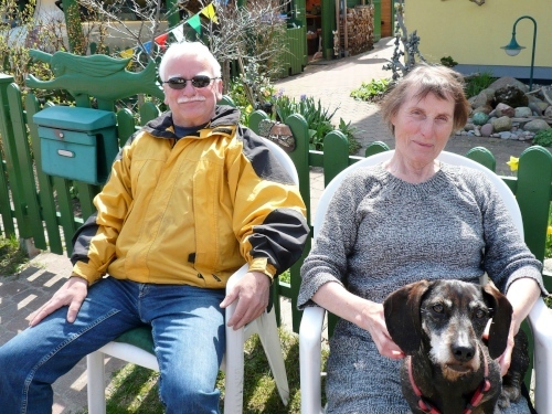 Wir laufen der Süd- und Chausseestraße entlang an den vielen niedrigen Häuser mit ihren tiefgezogenen Rohrdächern und den weitgeschwungenen Gauben. Hier, wo alles Weite und Raum hat, wachsen anscheinend die Häuser, von Hecken und uralten Bäumen geschützt, aus der Landschaft. Rechts der Straße hängt am Gartenzaun eine ganz besondere Girlande. Sie ist aus Startnummern von vielen Rennsteigläufen und anderen Bergmarathons gefertigt. Dabei gibt es offizielle Startnummern von: Bezirksvorstand Suhl des DTSB der DDR. Der „Täter“ sitzt vor dem Haus und bedauert, dass die Kniee nicht mehr mitmachen. Alles Gute und viele schöne Erinnerungen wünsche ich ihm.