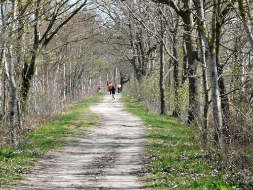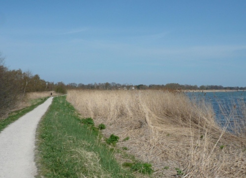 Hinter Km 38 kommen wir ins Bliesenrader Gehölz und haben wieder ein wenig Schatten. Vor mir sehe ich immer wieder Läufer, die abwechselnd gehen und laufen. Wir biegen vor der Siedlung Bliesenrade ab zum Bodstedter Bodden.