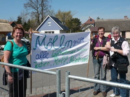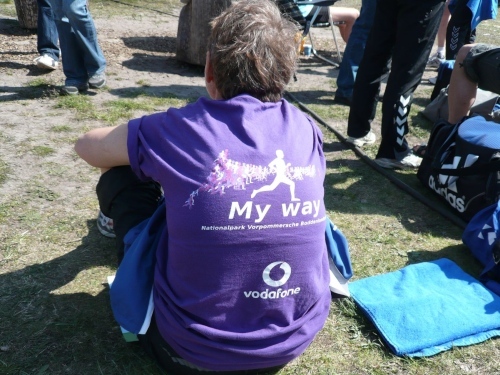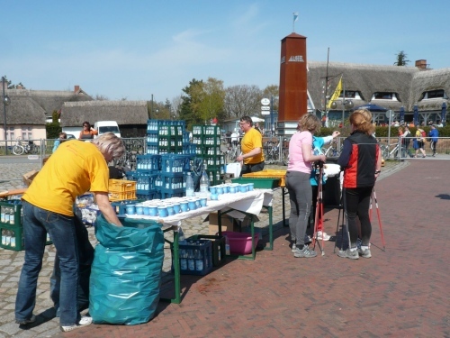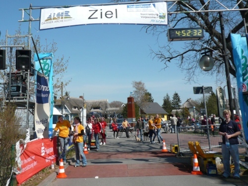 Wir verlassen den Wald hinter der letzten Getränkestation am Km Schild 40. Jetzt geht es noch knapp zwei Kilometer auf dem Wanderweg zwischen Wiese und Schilf immer am Wasser der Boddenküste entlang nach Wieck. Wir erreichen das 800 Seelendorf über den Bliesenrader Weg, hören schon das Ziel, sehen es aber nicht. Dann kommt das Schild Km 42, die Trommlergruppe und dann taucht neben der Darßer Arche endlich das ersehnte Zieltor auf.