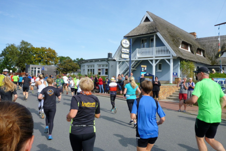 Nach einigen Startfotos und dem notwendigen Überqueren der Startmatte finde ich mich auf dem Weg aus Wieck heraus, unterstützt von zahlreichen Einheimischen und Gästefans, ziemlich am Ende des Feldes wieder. Der Weg ist weit - mal schauen, was er so bringen wird. Einen komplett flachen Kurs erwartend habe ich Elke für in viereinviertel Stunden wieder herbestellt. Ein großer, rechts ausholender Bogen bringt uns in Richtung Prerow. Wer meint, ehemals drei kleine Inseln (Zingst, Darß und Fischland), durch Verlandungen und eine Sturmflut 1872 zusammengewachsen, seien zu klein, einen Marathon über eine einzige Runde auszutragen, irrt. Zahlreiche Häuser sind mit bunten Wimpeln geschmückt, als benötigten sie diese Aufhübschung. Ganz im Gegenteil kann ich mich schon jetzt gar nicht sattsehen an vielen, teils erkennbar auch historischen, reetgedeckten Häusern, ein Augenschmaus.