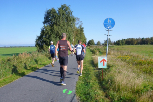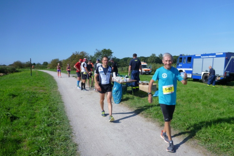Schön ist es im Urwald, nicht so aufgeräumt wie in den üblichen bewirtschafteten Nutzwäldern, die man so kennt. Nach 15 km kommt die nächste Verpflegung, diesmal kredenzt von gutgelaunten Feuerwehrkameraden. Über einen weiteren markanten Knotenpunkt, den Großen Stern (sieht etwas anders aus als der Berliner) kommen wir weiter in Richtung Ostseeküste voran. So geht es in fröhlicher Unterhaltung weiter, bis wir an km 19 auf den Küstendeich wechseln. Inzwischen habe ich gelernt, dass Peter heute nach zwanzig Jahren Pause seinen 18. Marathon läuft. Zehn davon blieb er unter drei Stunden. Den ersten lief er mit 45 Jahren, den letzten mit 60 in 2:57 Std. Mein Respekt wird immer größer.