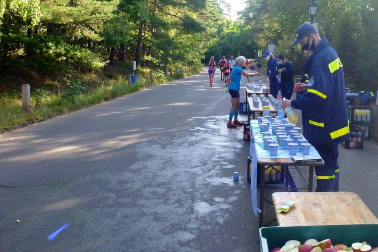 Zum ersten Mal gibt es nach sieben km zu trinken, etwas spät für meinen Geschmack, letztlich natürlich kein Problem, denn die Dichte der Versorgung wird zunehmen. Auch die Qualität lässt für mich nichts zu wünschen über: Es gibt in Bechern bereitgestelltes Wasser, Tee, Iso, Cola und in Einzelschälchen portioniertes Obst, perfekt. An der Einbiegung Hagenstraße, etwa bei km 8,5, steht Elke mit zwei in Athen ergatterten Gels und hat die mörderischen 200 m von unserer Unterkunft Hotel Rennhack nicht gescheut. Nach zehn km stehen 1:02 Std. auf dem Tacho, Peter wirkt glücklich und zufrieden, es läuft rund.