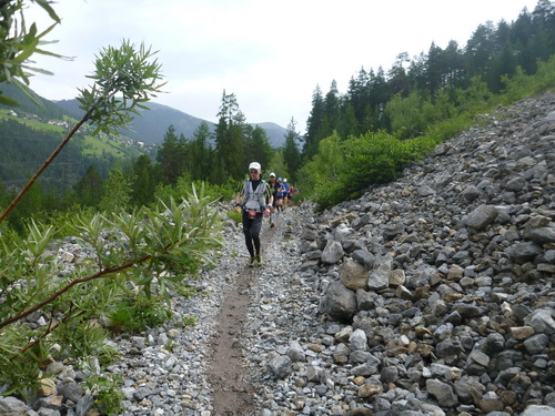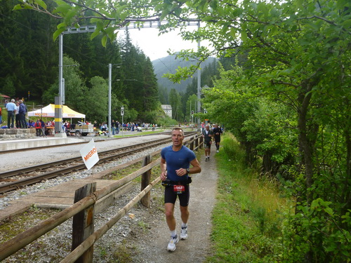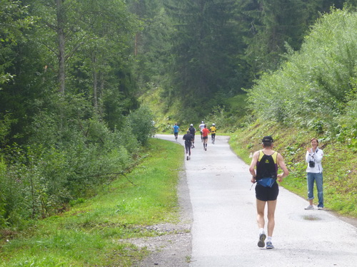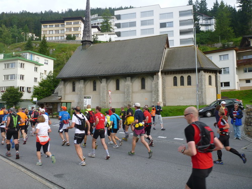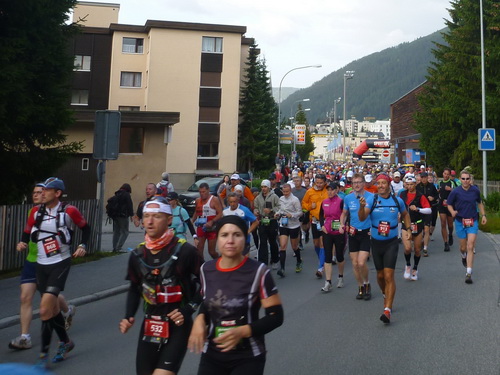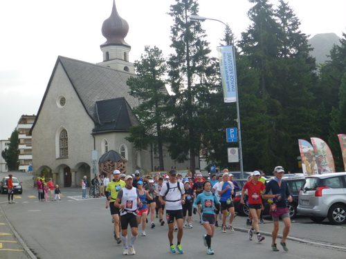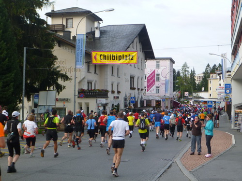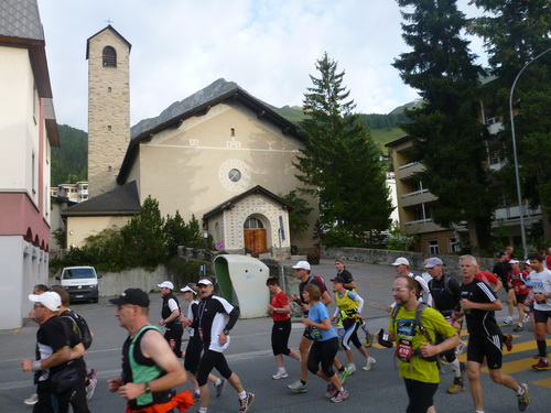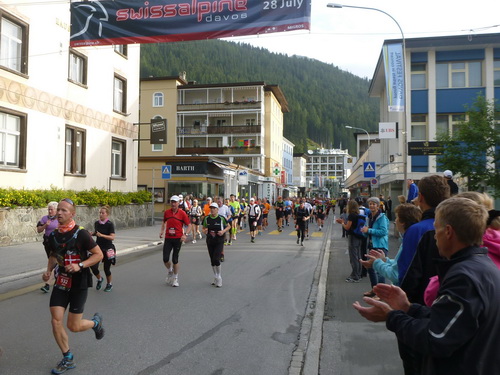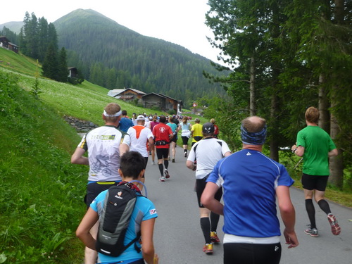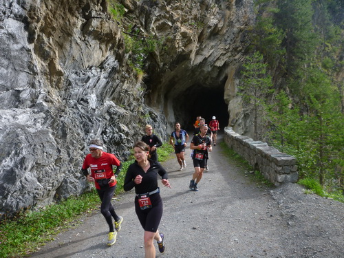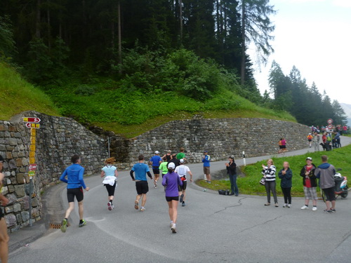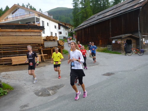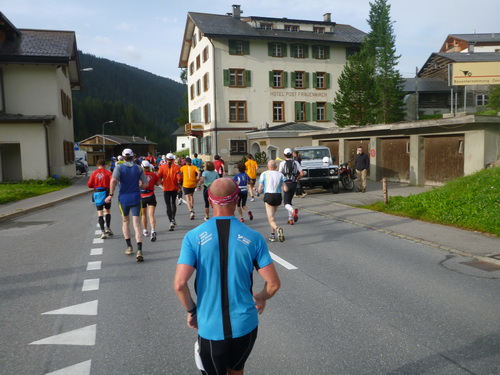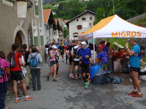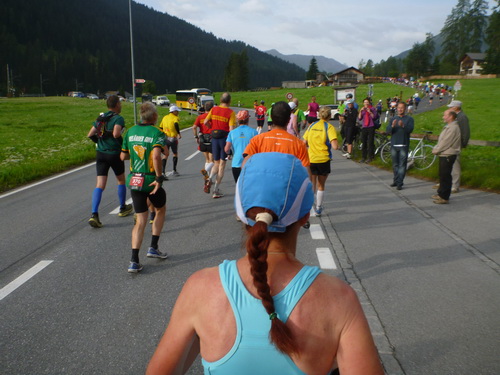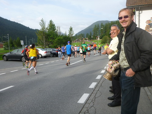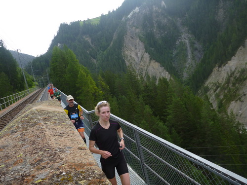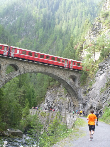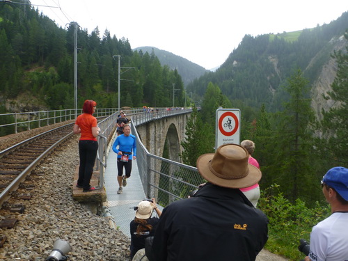 Kurz nach dem Viadukt warten einige Höhenmeter (rund 50) zum Bezwingen. Das Feld bewegt sich im Gänsemarsch, weil der Pfad sehr schmal ist. Doch von kurzer Dauer ist die Engstelle, denn ab Kilometer 27 bei Schönboden (1220 Meter) weitet sich das Tal. Unser Blick in die Landschaft kann umher schweifen. Auf gutem Geläuf, zum Ende auch asphaltiert, geht es hinab nach Filisur. Ab Ortseingang nimmt das Zuschauerinteresse spürbar zu.