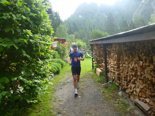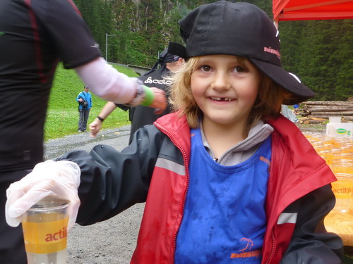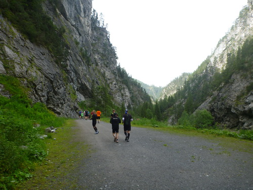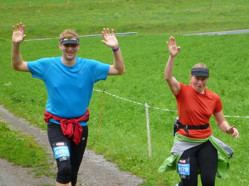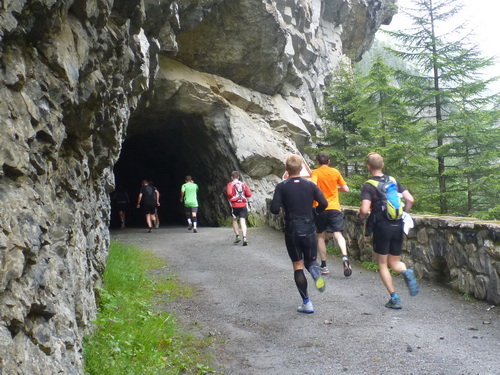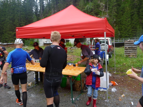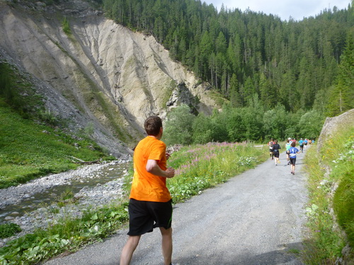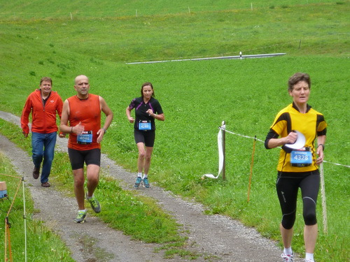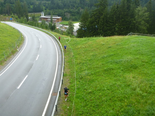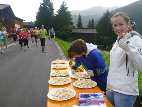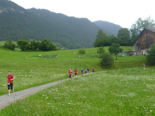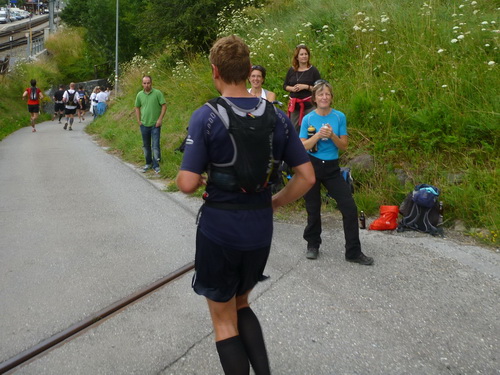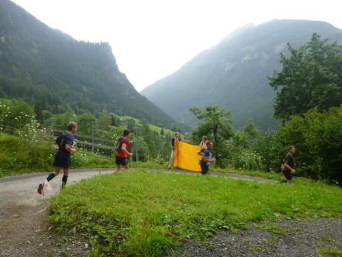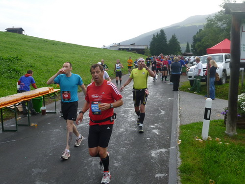 Nur ein kleines Stückchen weiter verlassen wir die Hauptstraße nach rechts. Ein paar Höhenmeter müssen wir erlaufen, bis wir in Lengmatte die zweite Tankstelle finden. Bananen und Iso stehen im Angebot. Später kommen noch Riegel, Alpinbrötli, Bouillon, Cola und Gel hinzu. Verhungern und verdursten muss da niemand. Doch eine regelmäßige Flüssigkeitsaufnahme ist angeraten, auch wenn es jetzt kühle und für das Laufen optimale Temperaturen hat.