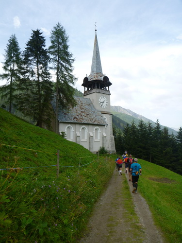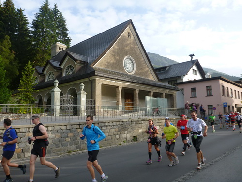 Der Laufuntergrund ist so, wie ich ihn liebe. Befestigt, breit, richtig zum Dahinrennen, wenn noch massig Körner vorhanden sind. Die Kirche St. Martin grüßt zu uns herüber, denn sie liegt leicht oberhalb des Dorfkerns von Filisur.