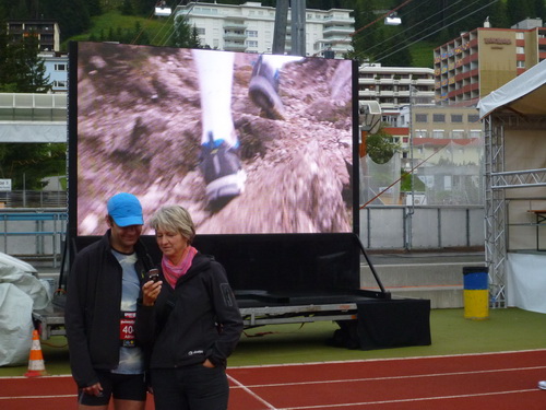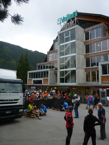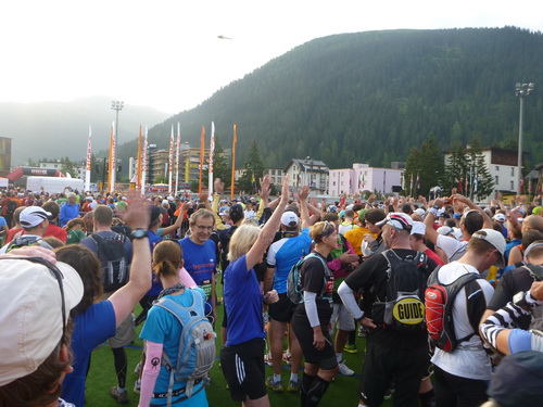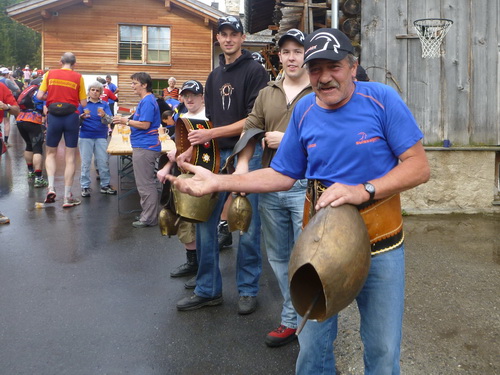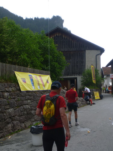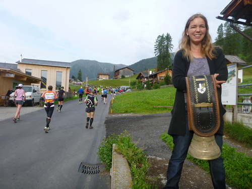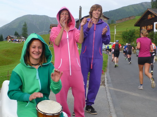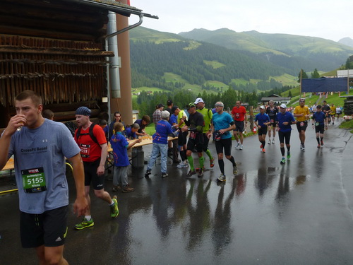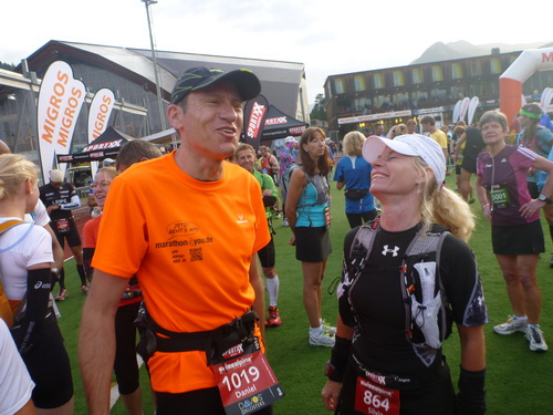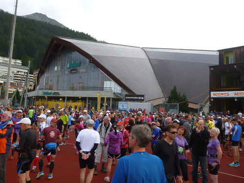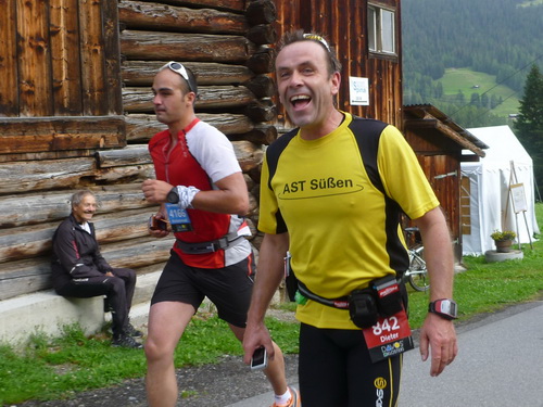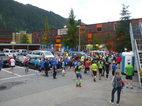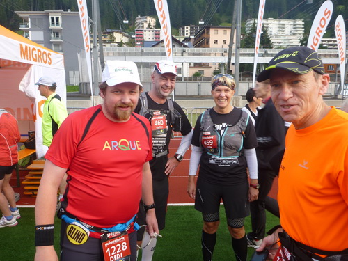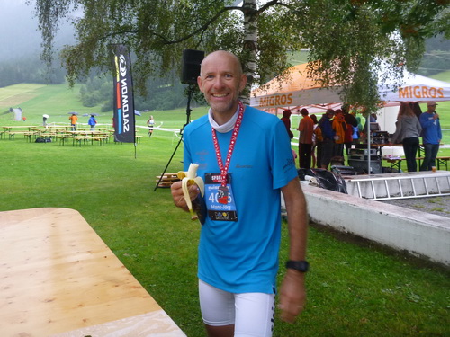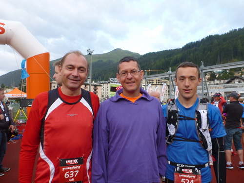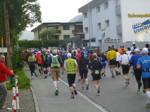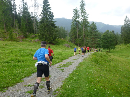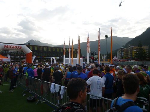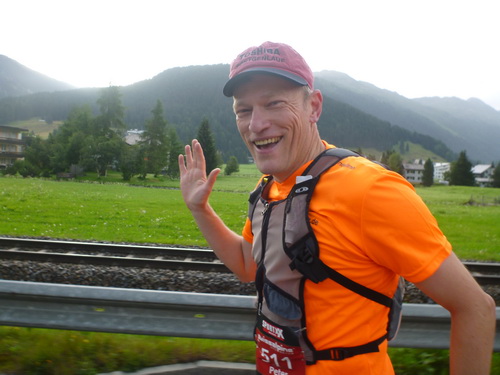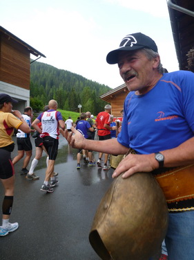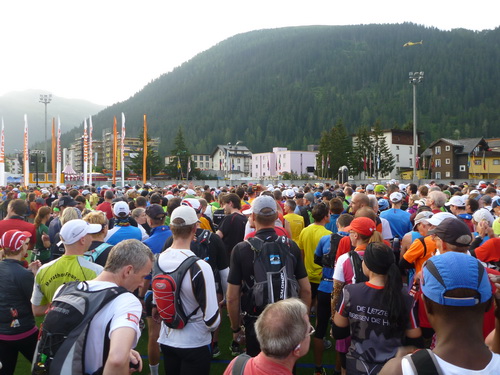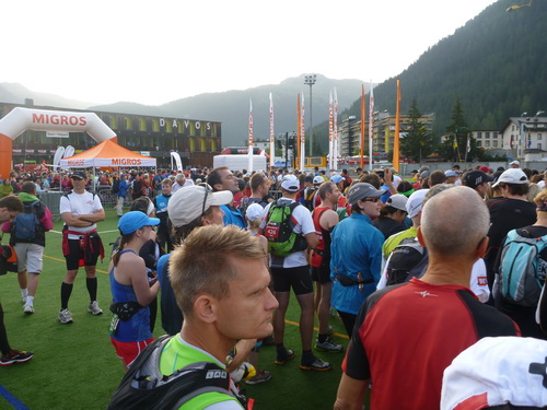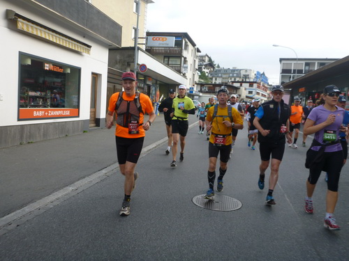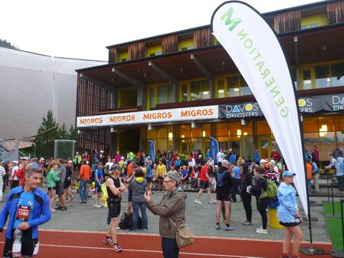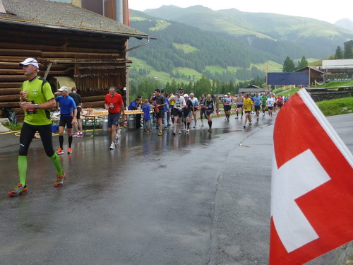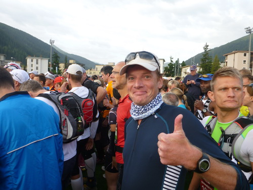 Die gestrige Hitze wurde am Abend vorher von einem Gewitter davon gewaschen, doch jetzt um halb sieben sind am Himmel erste Aufhellungen zu sehen. Vielleicht kommen wir trocken durch den Tag. Musik, Moderation und Gespräche vertreiben mir schnell die Zeit. Felix Benz, Daniel Steiner und auch unser Cheffe tauchen kurz vor dem Start auf. „Du hast meine Nummer“, feixt noch Klaus und spielt wohl darauf an, dass ihm der vermeintlich leichtere Lauf zustünde. Aber wie ich ihn kenne, ist er doch scharf auf die Keschhütte und den Sertigpass. Vielleicht tauschen wir im nächsten Jahr.