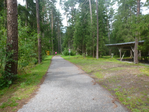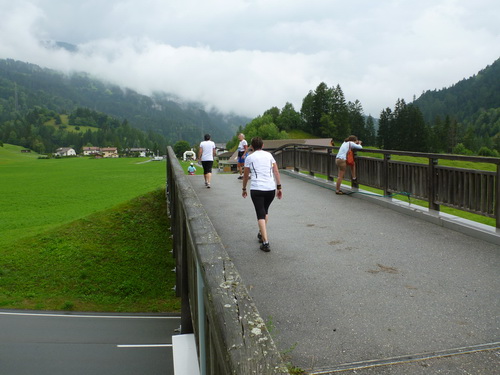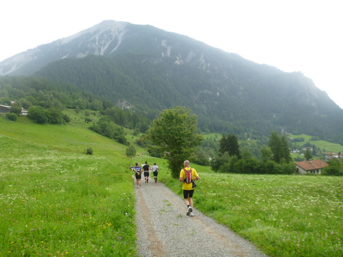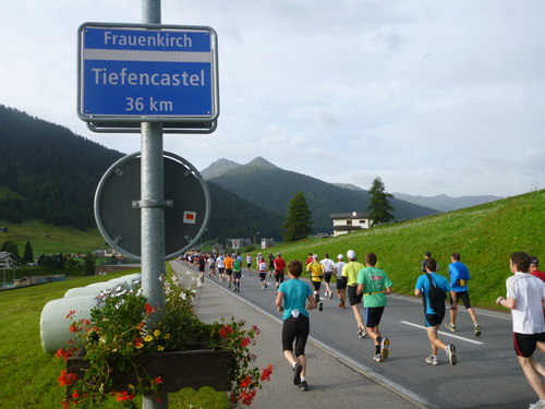 36 Kilometer, das lese ich auf der Ortstafel, ist Tiefenkastel entfernt. Und da wir nicht auf direktem Weg auf der Straße laufen werden, ist unser Ziel noch zwei, drei Einheiten weiter weg. Die nächsten Kilometer verlaufen auf der für den Verkehr gesperrten Hauptstraße. Früher ist man auf einem asphaltiertem Rad- und Feldweg gelaufen, wo es mitunter Drängelei gab. Doch jetzt ist Platz genug und die Konzentration werden wir später noch genügend brauchen. So gefällt mir das Einrollen.