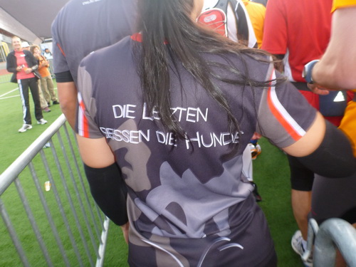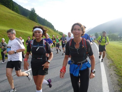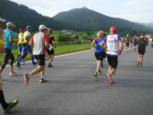 Durch die Gespräche verpassen wir die Aufstellung im Startblock und werden erst aufmerksam, als ein Schuss den Start um Punkt sieben Uhr markiert. Durch die Vorverlegung um eine Stunde und der Zielschluss auf 21.00 Uhr haben die Teilnehmer 14 Stunden Zeit, den langen Kanten hinter sich zu bringen. Doch es gibt einige Cut-offs, die einzuhalten sind. Als ich mich hinten in den Block stelle, lese ich auf dem Rücken einer Läuferin: “Den letzten beißen die Hunde.“