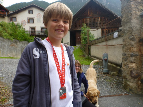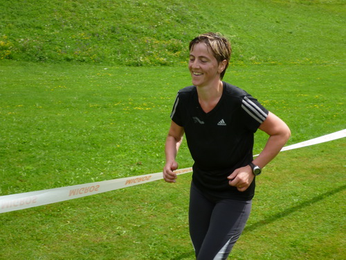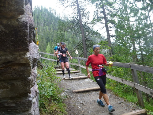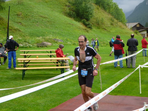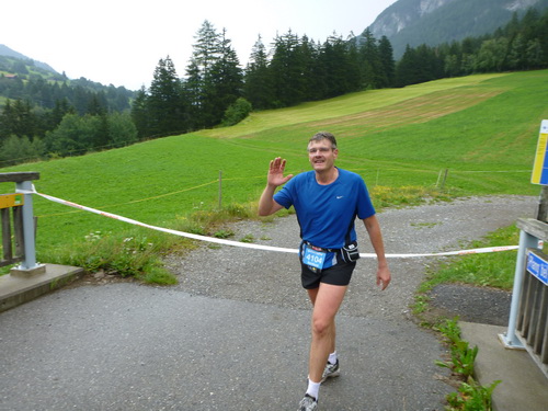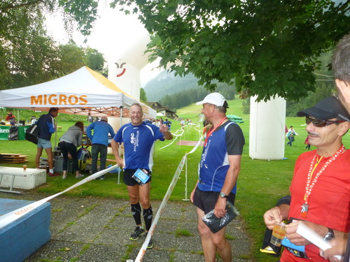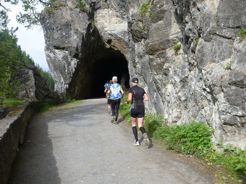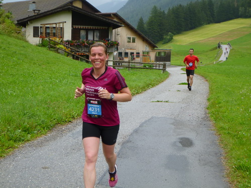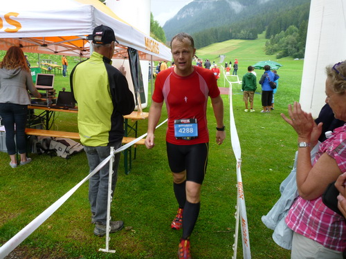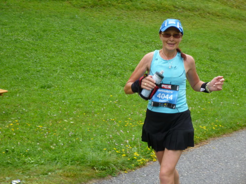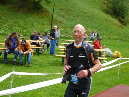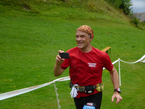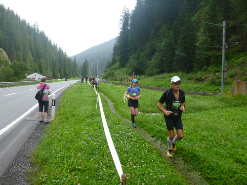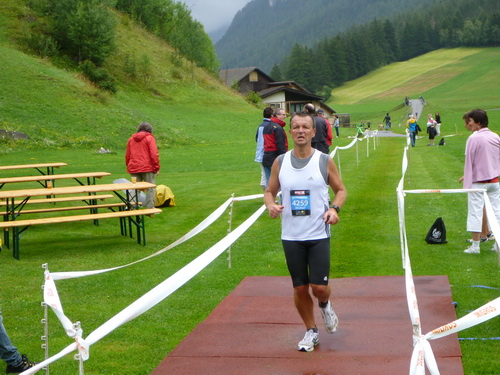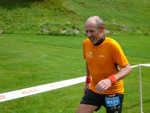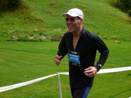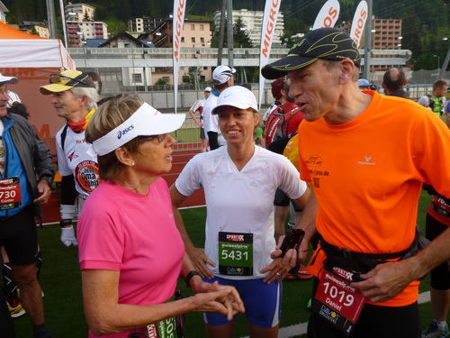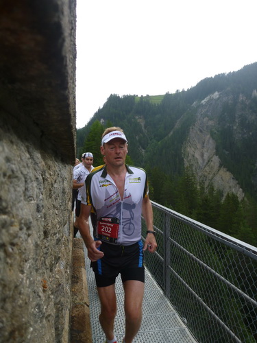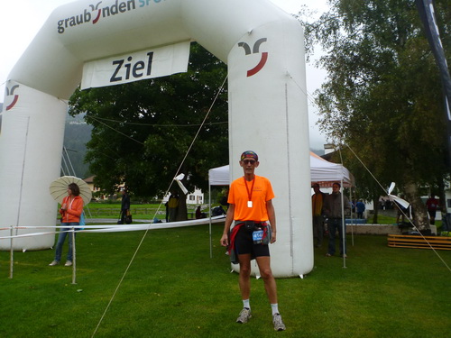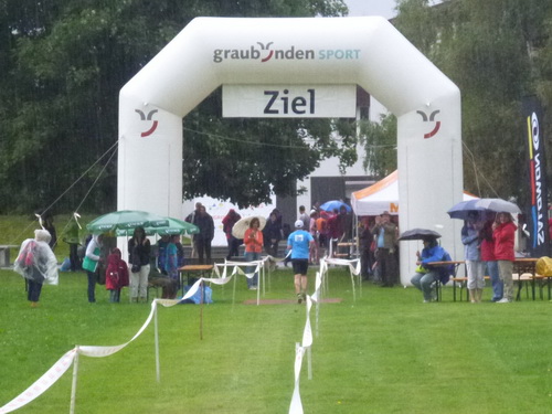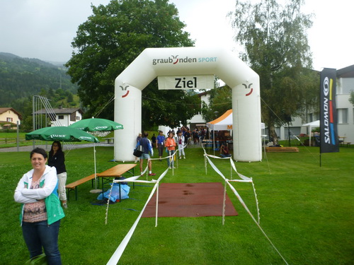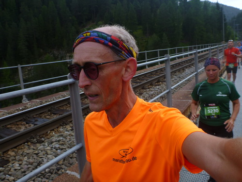 Doch dann kommt noch etwas für den Schweinehund daher. Immer weiter bergauf geht es schließlich neben der Leitplanke der Julier-Pass-Straße auf abschüssigem Grasweg hin zu einer Brücke. Da warten 20, 30 Treppen für das Bezwingen der Brücke. Ein vorheriges Treppentraining ist dafür lohnenswert. Und dann auf der Brücke sehen wir den Zielbogen in 400 Meter Entfernung. Und da lasse ich es laufen. Gerade noch rechtzeitig, denn nur eine Minute zeigt die Uhr Puffer, dann sind vier Stunden voll.
