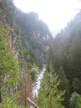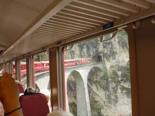 Ein Schild mahnt zum Weitergehen und verbietet das Rasten wegen Steinschlag. Einige Brücken überqueren hoch über uns das Tal. Reaktionsschnell kann ich sogar eine Zugfahrt auf den Chip bannen. Mittlerweile hat sich die Sonne ein wenig gegen die Bewölkung durchgesetzt.