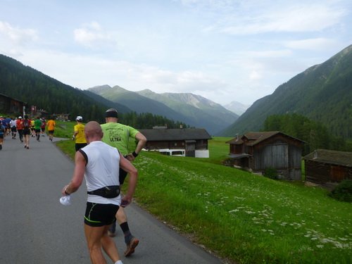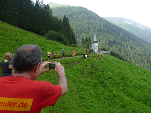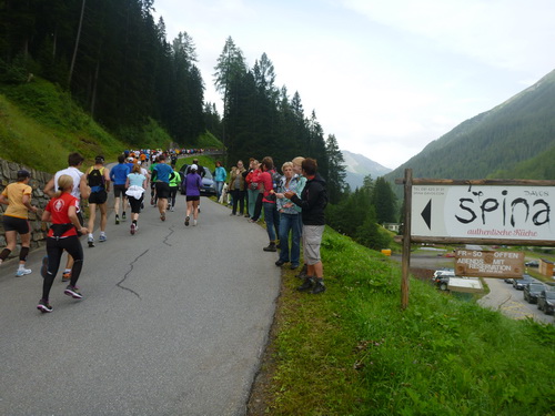 Es folgt ein längerer Anstieg hoch zum Weiler Spina. Die rund 100 Höhenmeter zwingen die Mehrzahl der Läufer zum Wandern. Ja, so ein Laufevent wird in der Bergen gern zum Hochgeschwindigkeitswandern. Auf der Steigung fällt mir ein breites Kreuz auf. Auf dem Shirt lese ich AST Süßen. Kenne ich den, vielleicht von Imst? Ja, es ist der Dieter Pflüger, der sich heute auf den K78 wagen will.