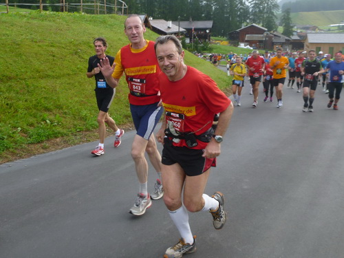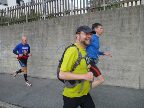 Die Talstraße ist breit genug, das fast 2000 Sportler umfassende Laufvolk aufzunehmen. Peter Ickert, dem klopfe ich auf die Schulter, hat es intelligenter gemacht mit seiner Startaufstellung, denn nach fünf Minuten kann ich auf ihn aufschließen.